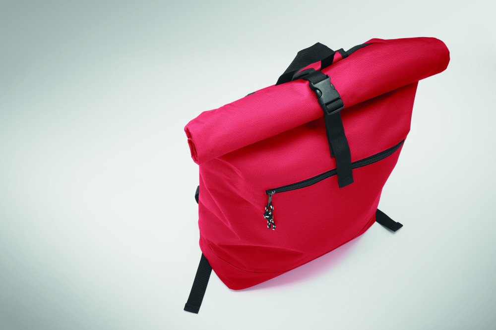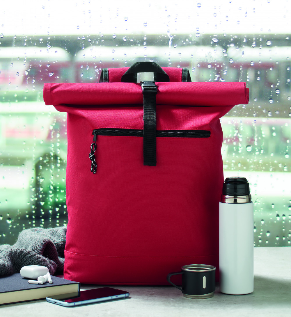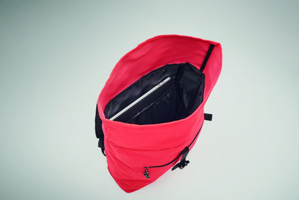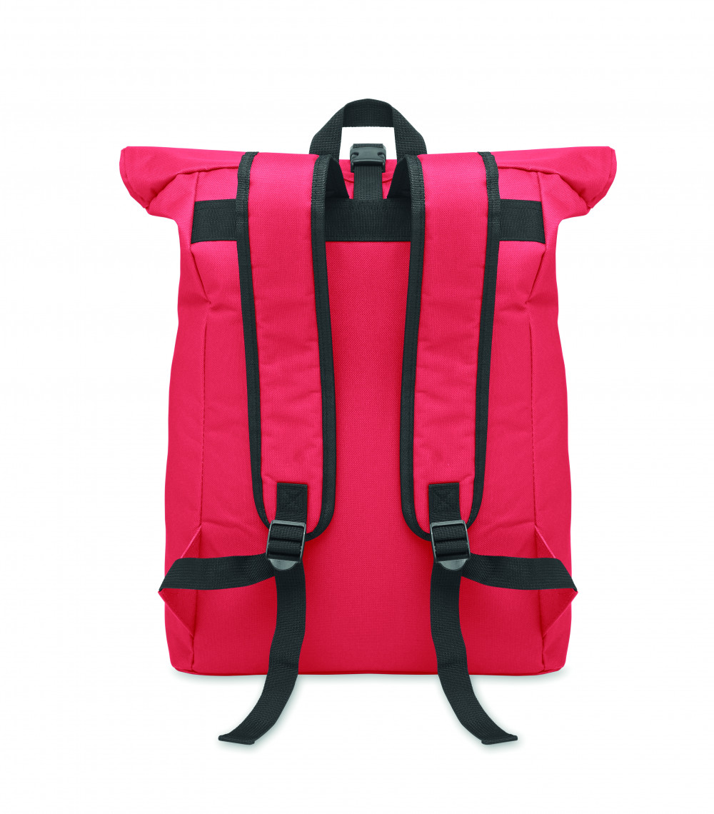 15 colos roll top csavart záródású laptop hátizsák 600D poliészterből, párnázott háttal és megerősített aljjal. Cipzáras elülső zseb. 210D bélés.