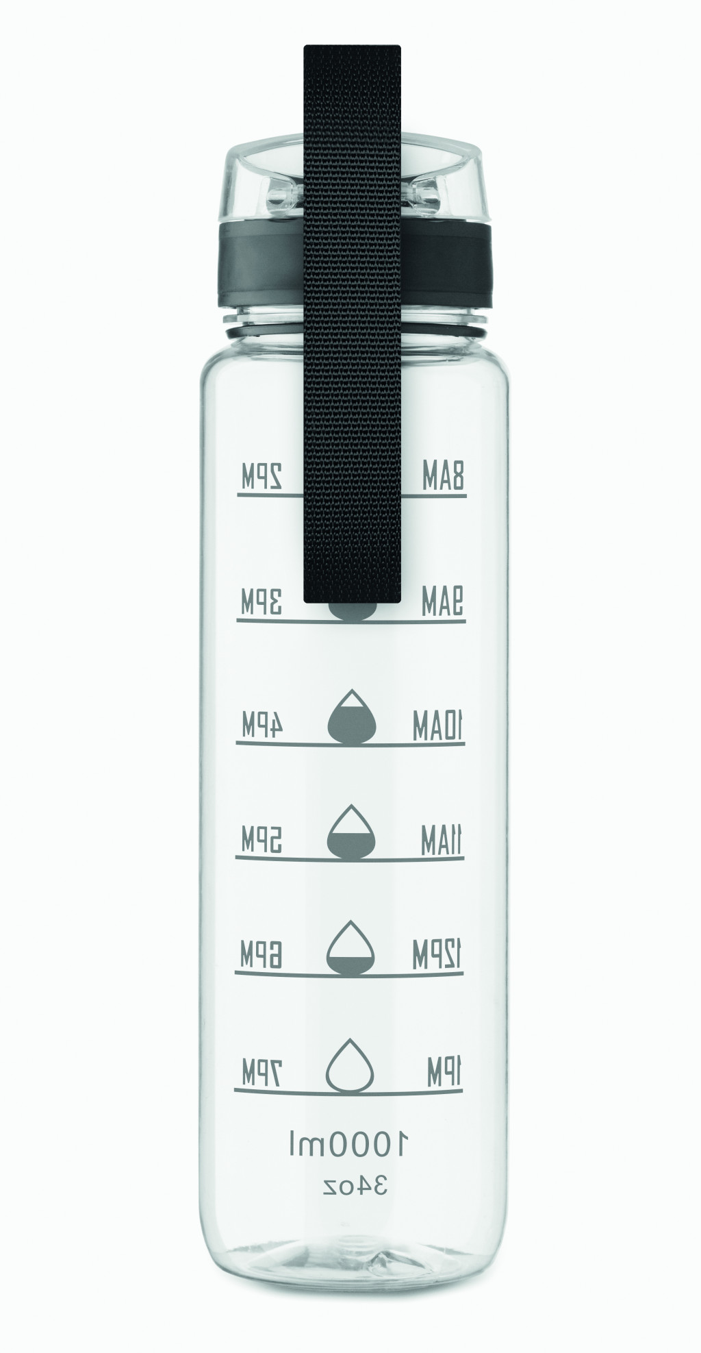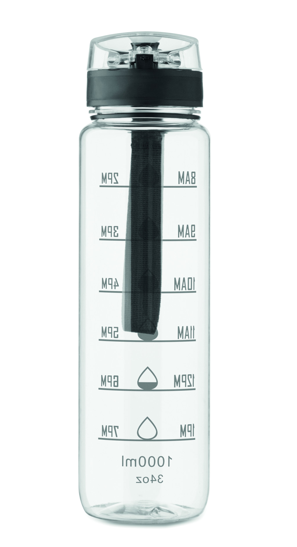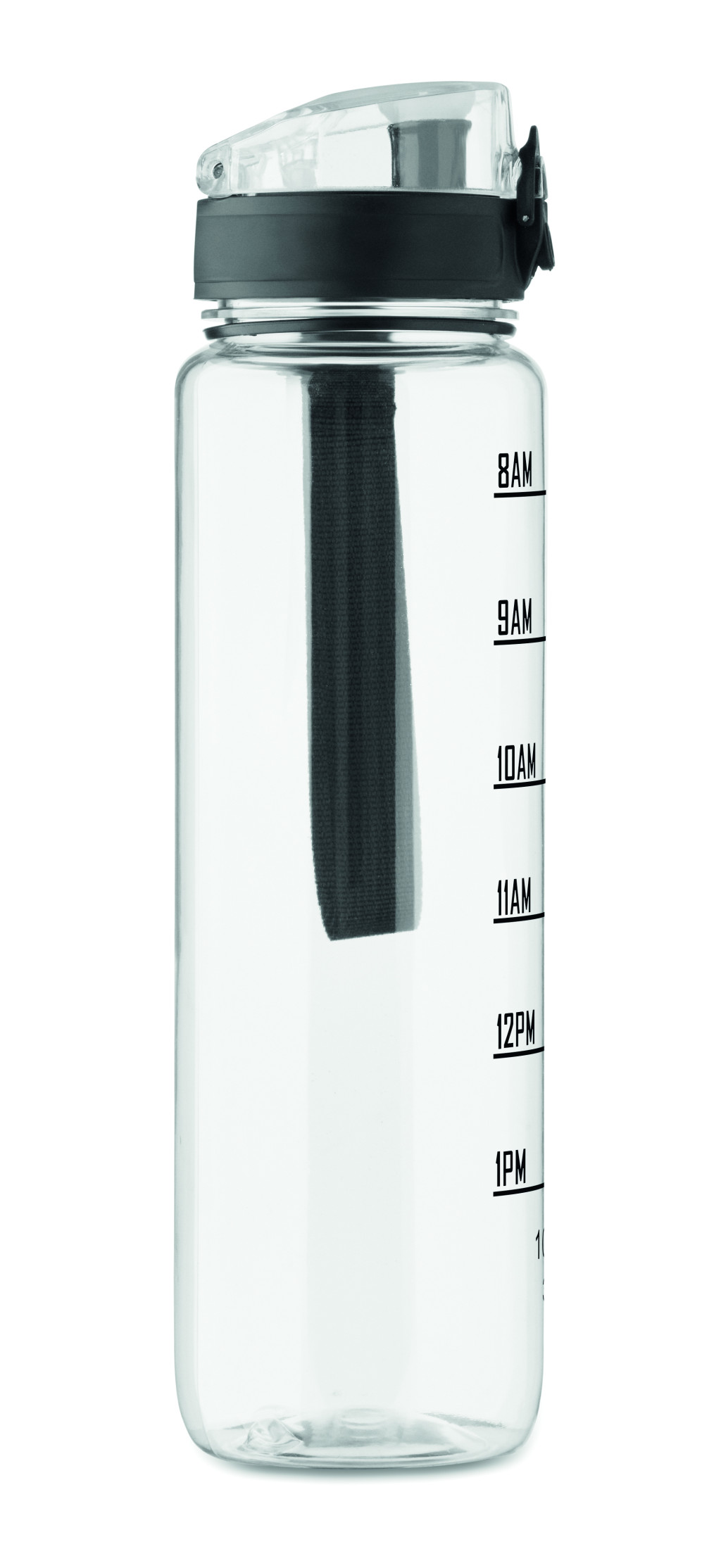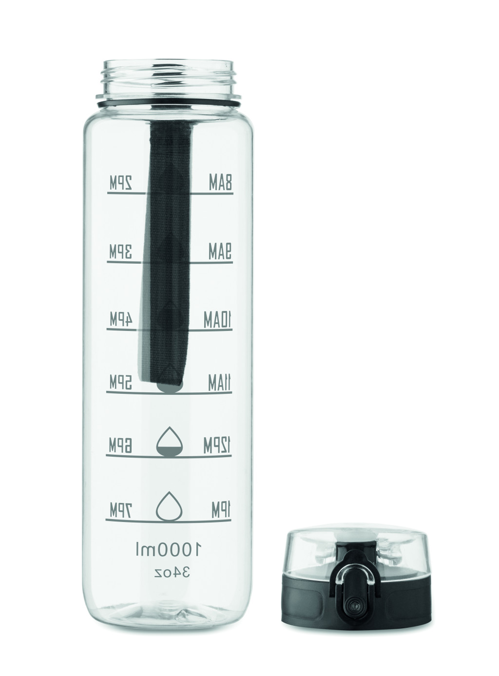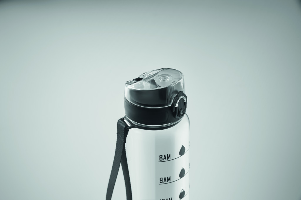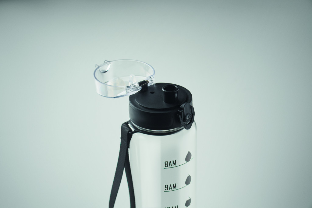 Sportkulacs RPET-ből, motivációs időjelzéssel, egy kézzel nyitható, felpattintható fedéllel, biztonsági zárral és hordfüllel. Szivárgásmentes. Űrtartalom: 1 liter.