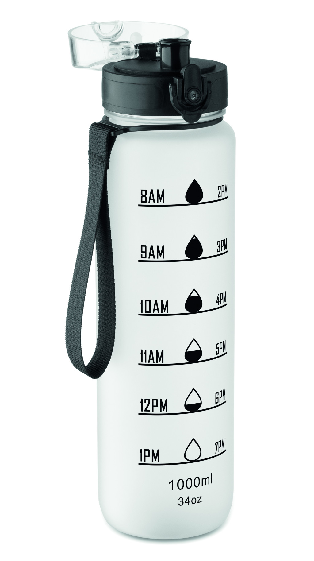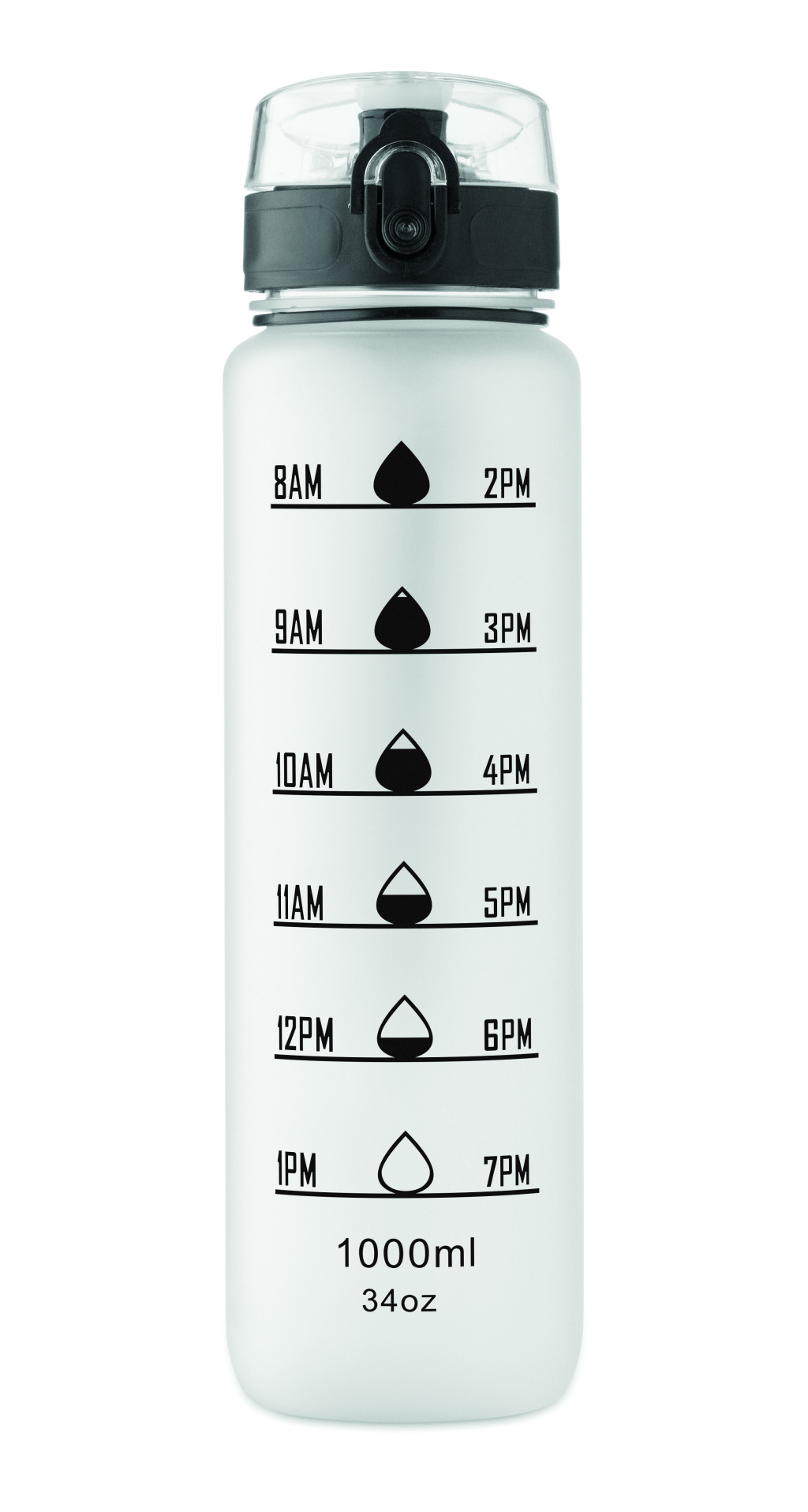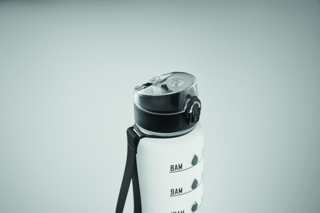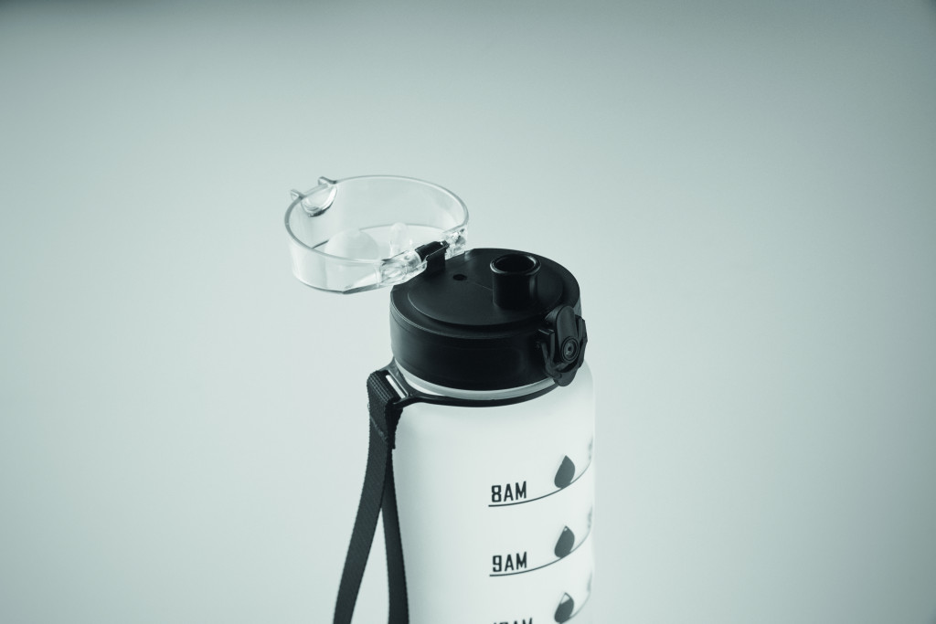 Sportkulacs RPET-ből, motivációs időjelzéssel, egy kézzel nyitható, felpattintható fedéllel, biztonsági zárral és hordfüllel. Szivárgásmentes. Űrtartalom: 1 liter.