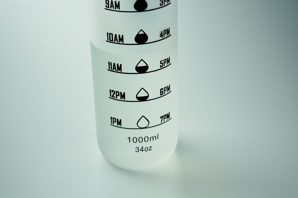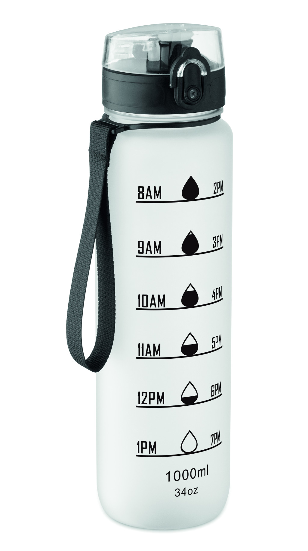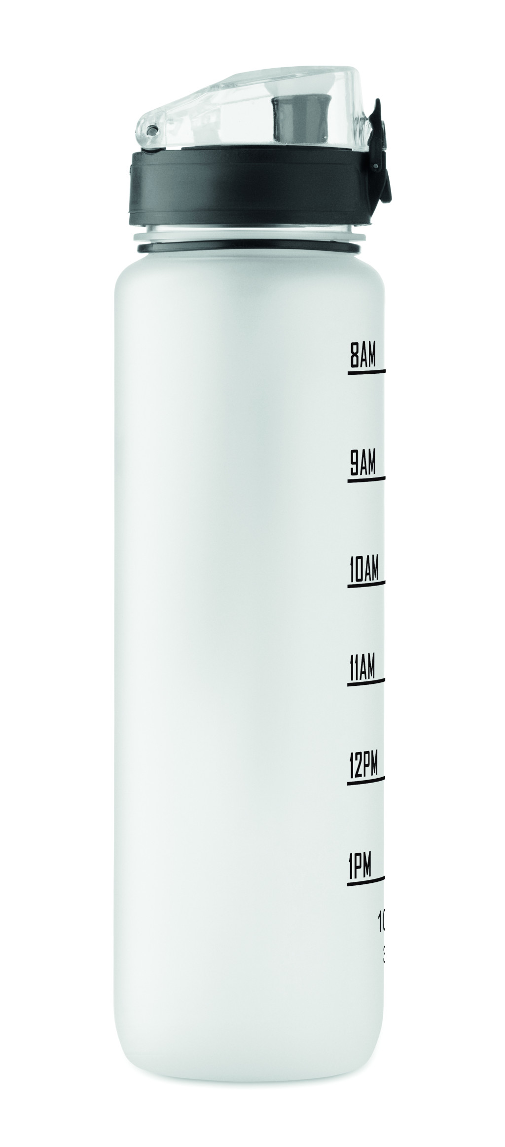 Sportkulacs RPET-ből, motivációs időjelzéssel, egy kézzel nyitható, felpattintható fedéllel, biztonsági zárral és hordfüllel. Szivárgásmentes. Űrtartalom: 1 liter.
