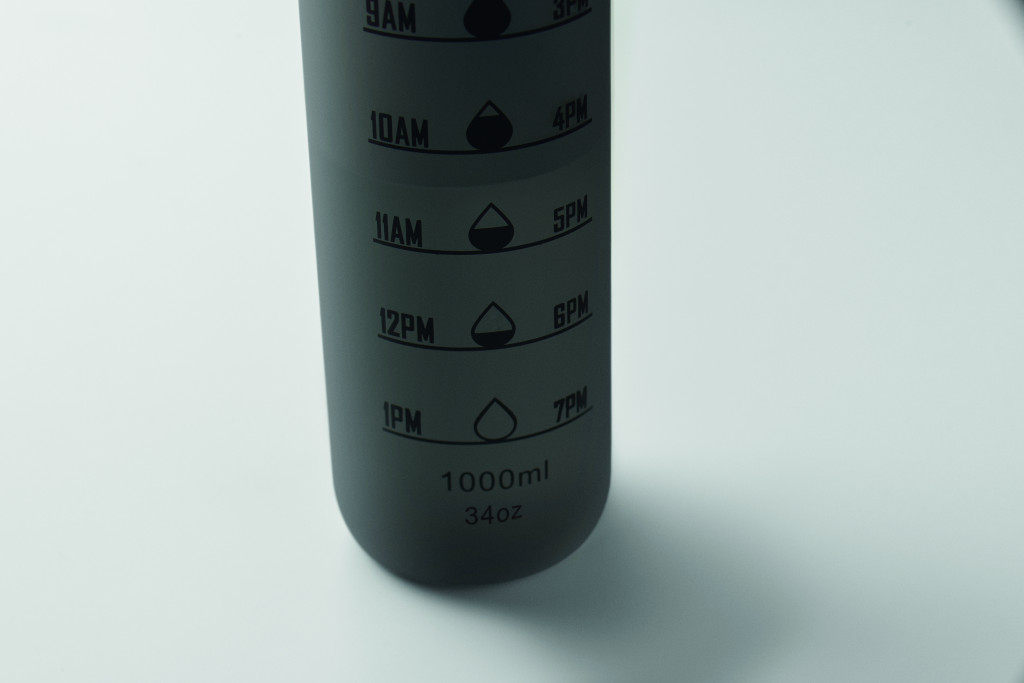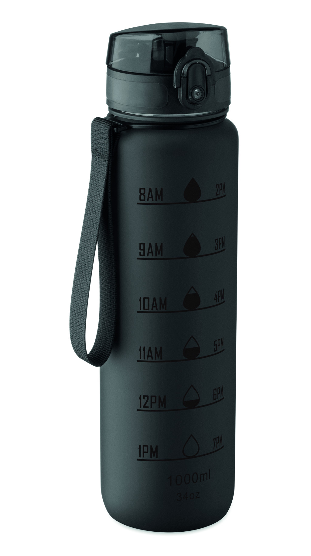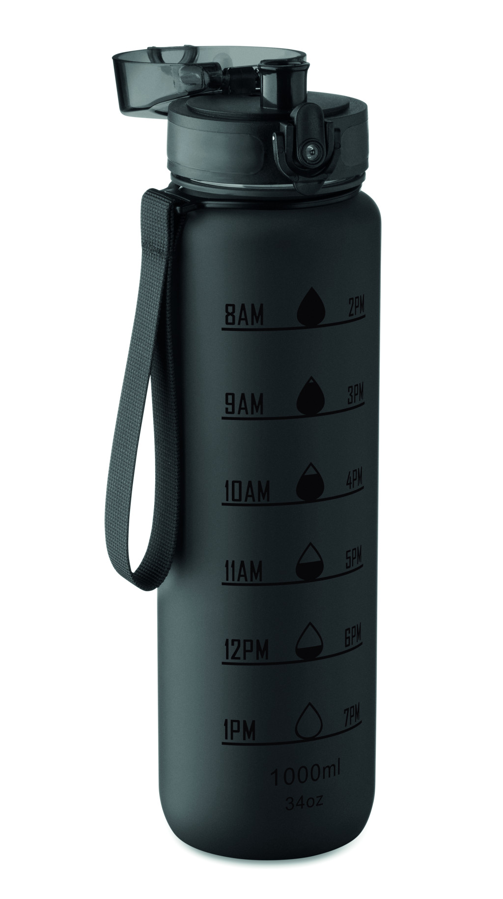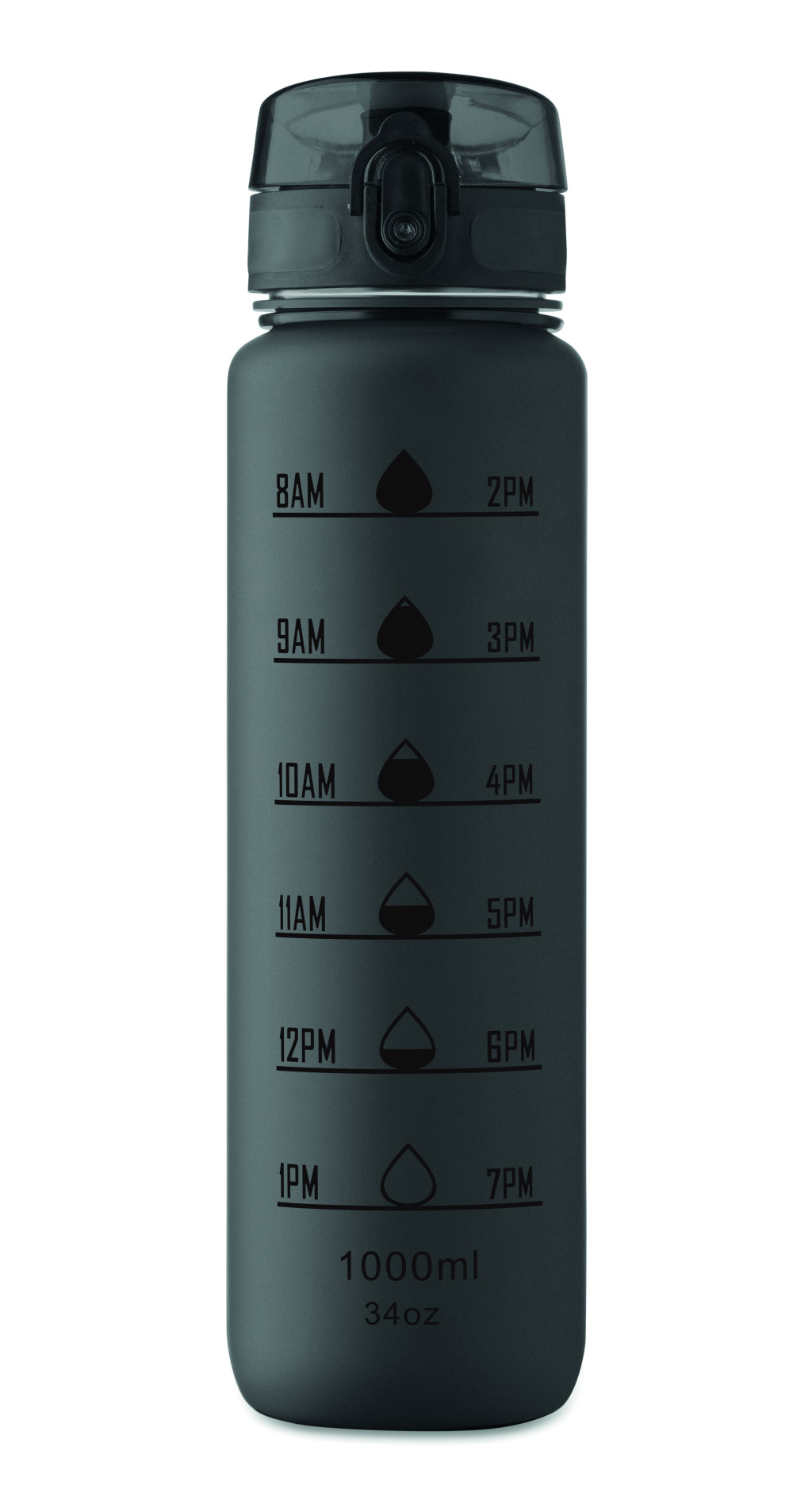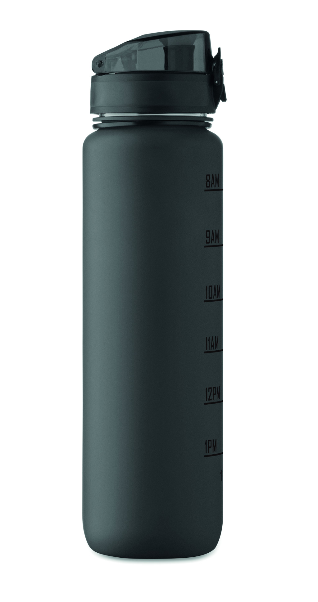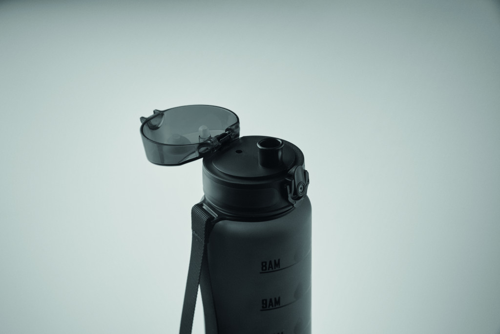 Sportkulacs RPET-ből, motivációs időjelzéssel, egy kézzel nyitható, felpattintható fedéllel, biztonsági zárral és hordfüllel. Szivárgásmentes. Űrtartalom: 1 liter.