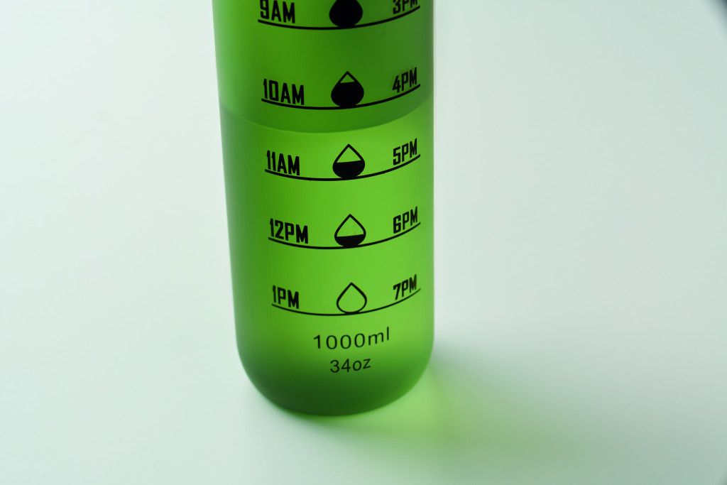 Sportkulacs RPET-ből, motivációs időjelzéssel, egy kézzel nyitható, felpattintható fedéllel, biztonsági zárral és hordfüllel. Szivárgásmentes. Űrtartalom: 1 liter.