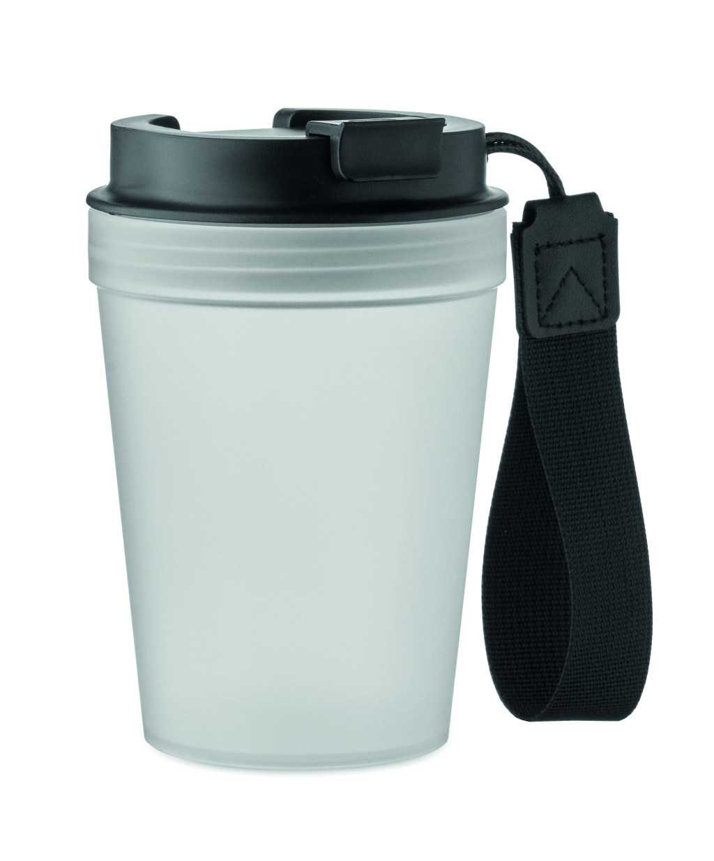 Szimplafalú pohár PP-ből, RPET poliészter pánttal. Szivárgásmentes. Űrtartalom: 300 ml. Mivel ez egy szimplafalú pohár, hőátadás előfordulhat.