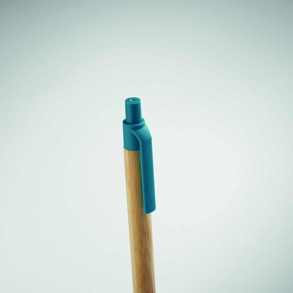 Nyomógombos golyóstoll bambusz tolltesttel, 50% búzaszalma és 50% ABS műanyag szerelvényekkel. Kéken író betéttel.