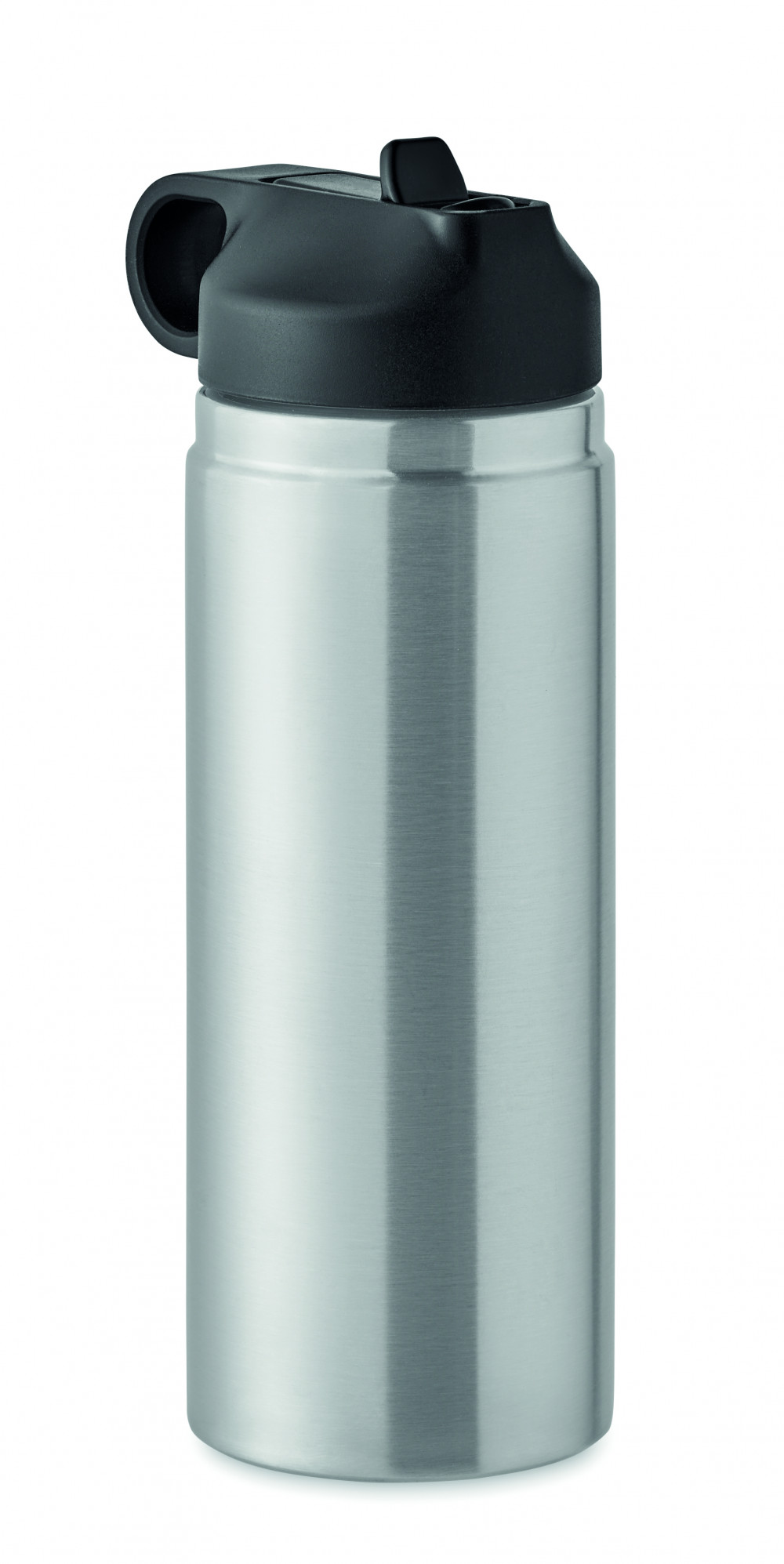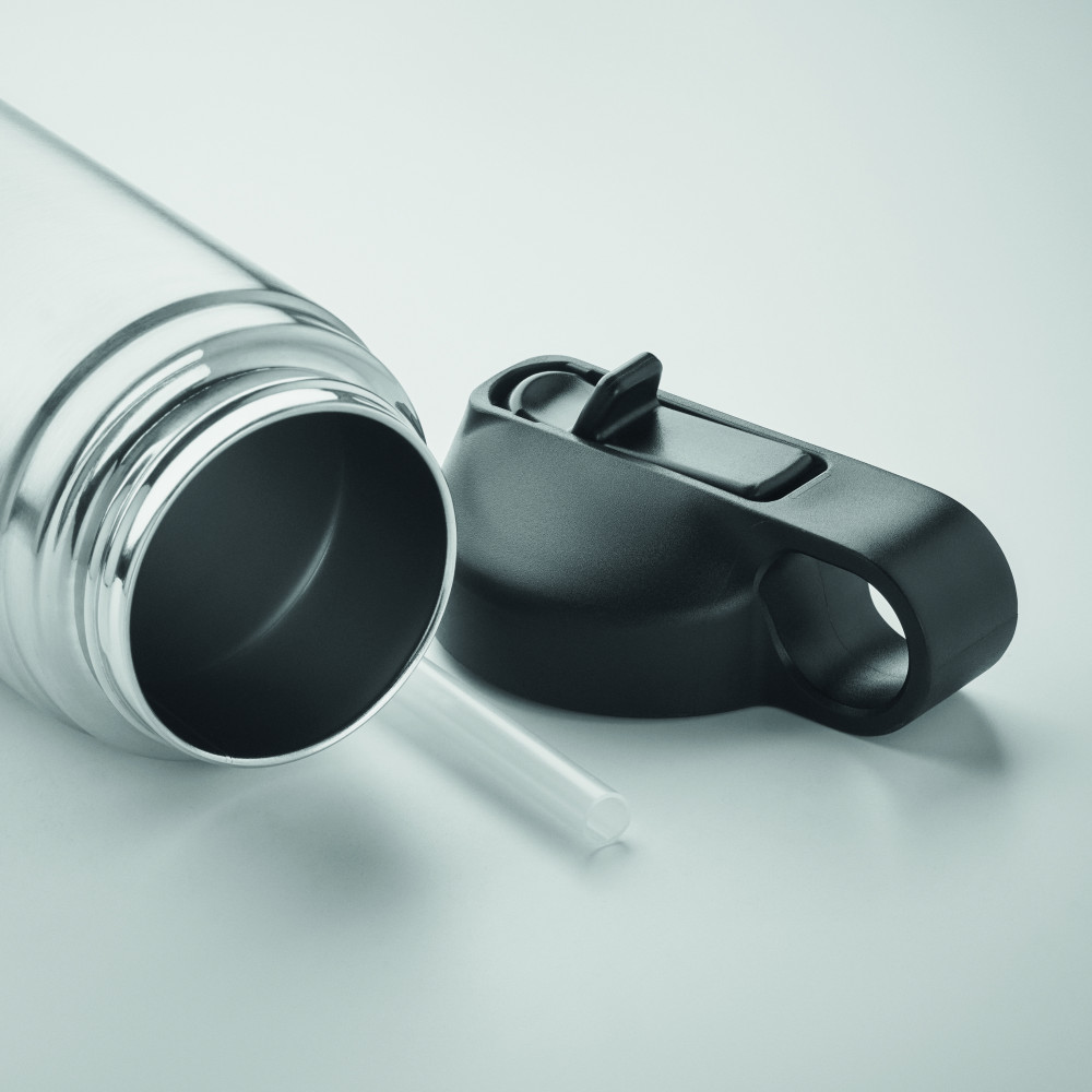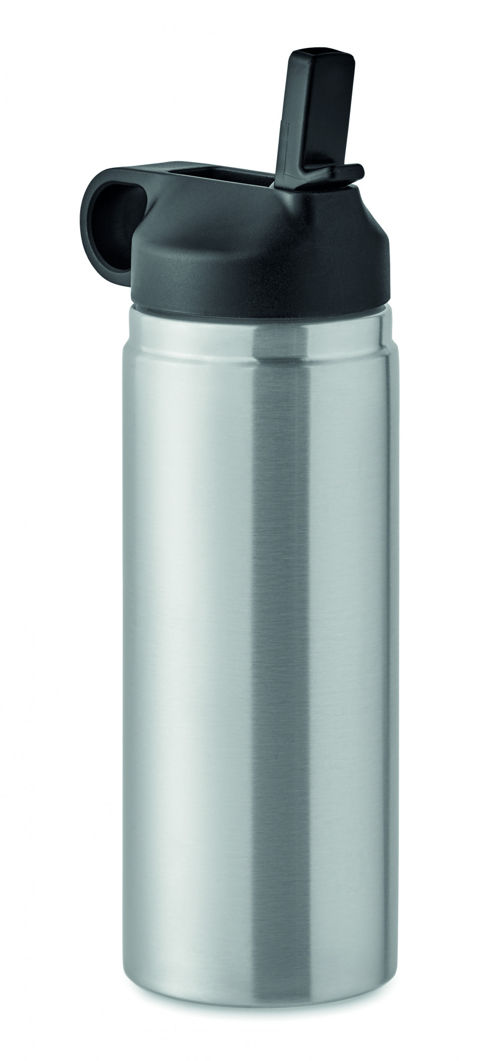 Duplafalú, újrahasznosított rozsdamentes acél (90% újrahasznosított rozsdamentes acél, 10% rozsdamentes acél) termoszpalack, PP fogantyús és beépített szívószálas fedéllel. Szivárgásmentes. Űrtartalom: 500 ml.