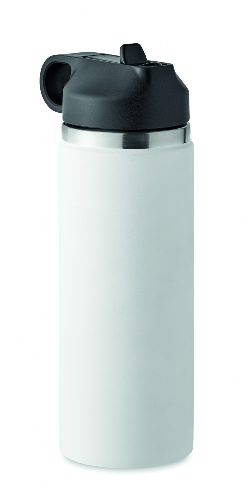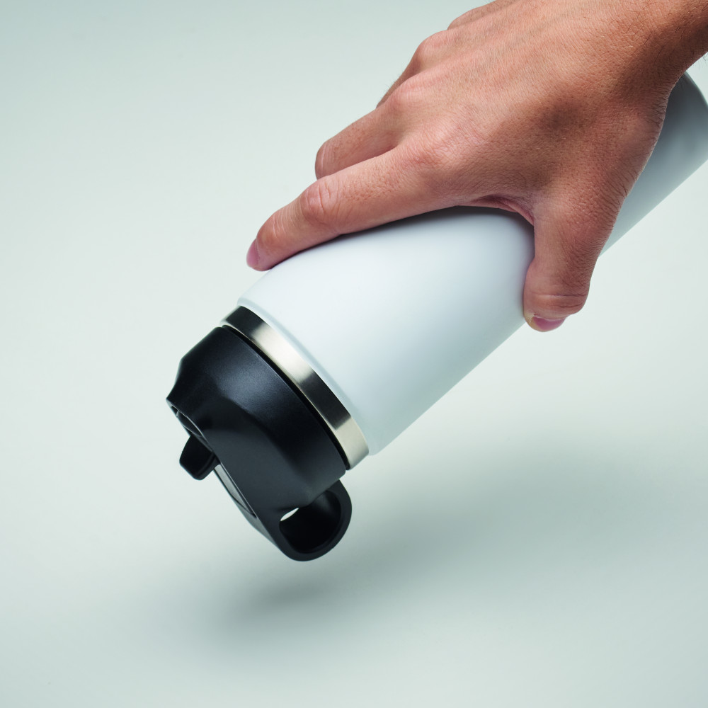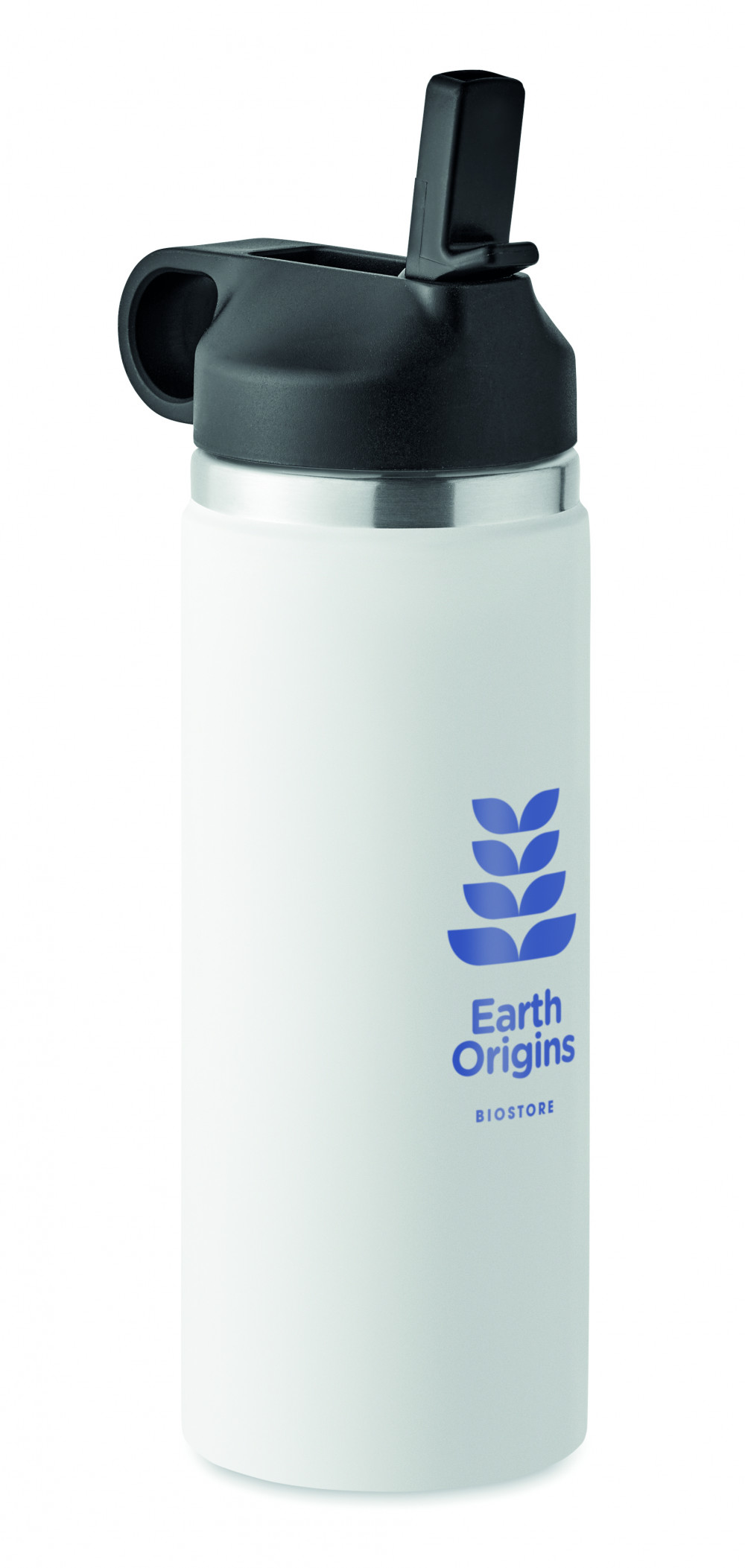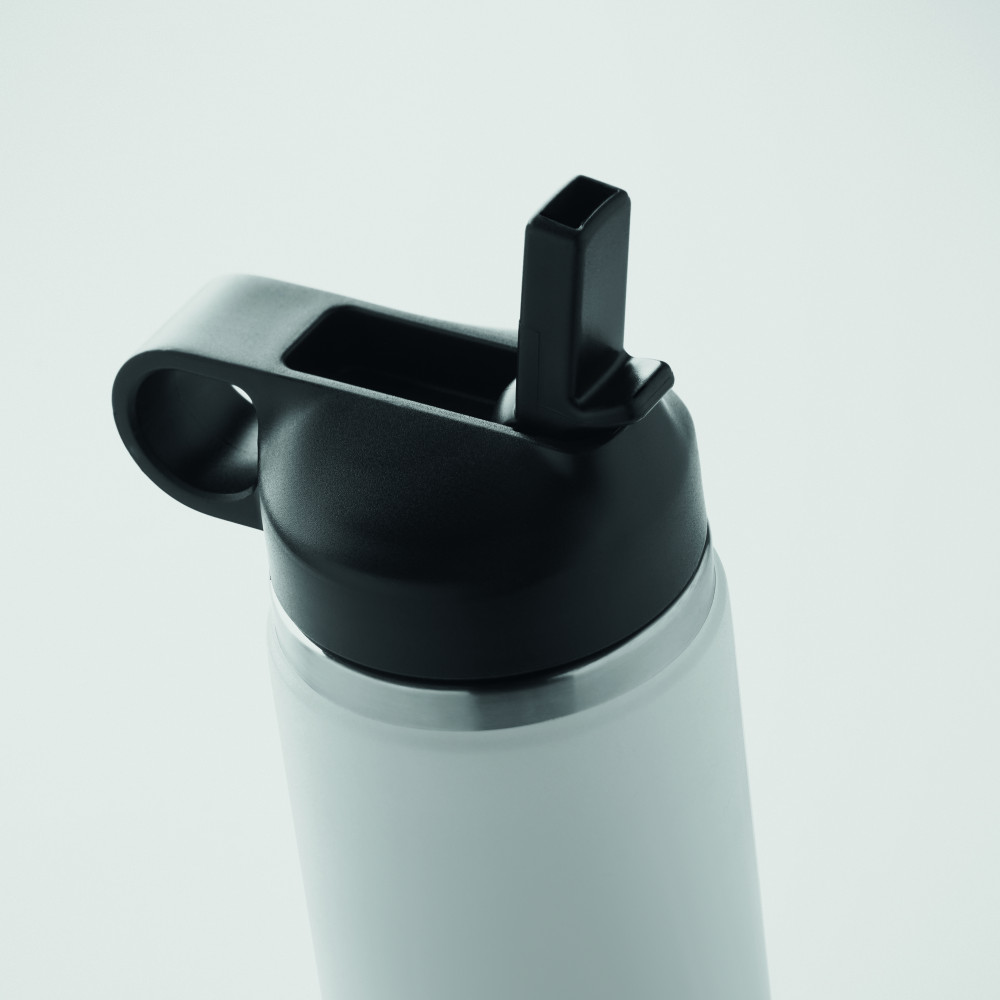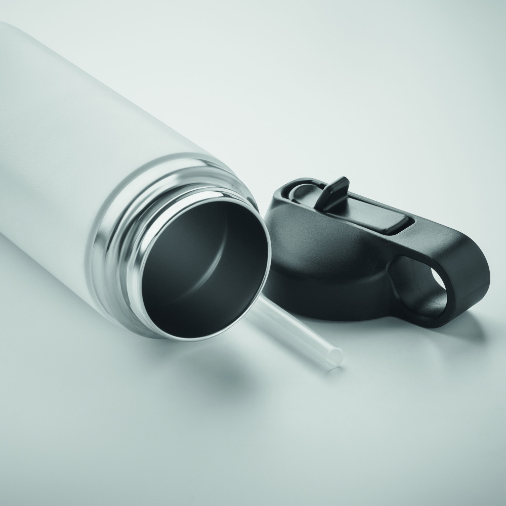 Duplafalú, újrahasznosított rozsdamentes acél (90% újrahasznosított rozsdamentes acél, 10% rozsdamentes acél) termoszpalack, PP fogantyús és beépített szívószálas fedéllel. Szivárgásmentes. Űrtartalom: 500 ml.