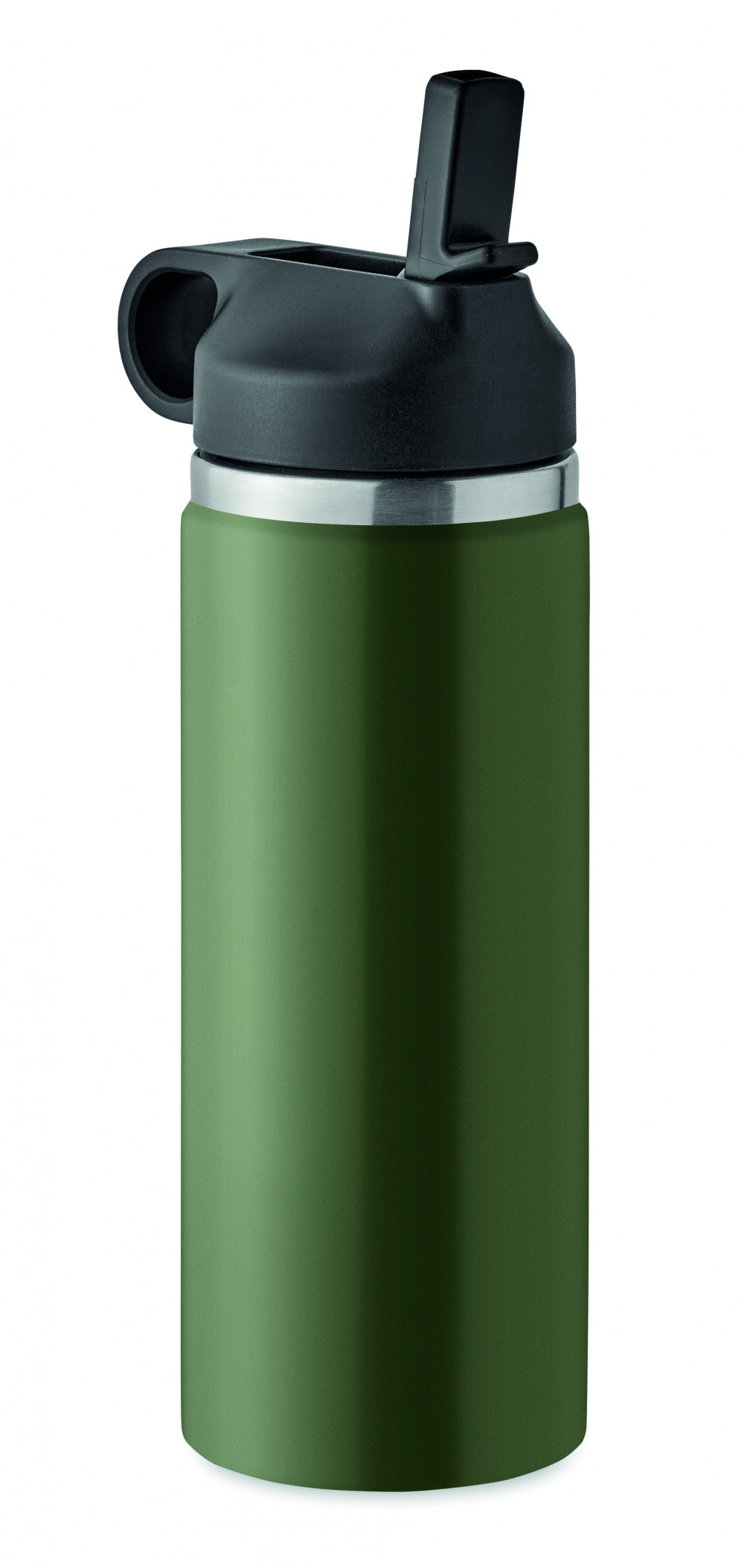 Duplafalú, újrahasznosított rozsdamentes acél (90% újrahasznosított rozsdamentes acél, 10% rozsdamentes acél) termoszpalack, PP fogantyús és beépített szívószálas fedéllel. Szivárgásmentes. Űrtartalom: 500 ml.