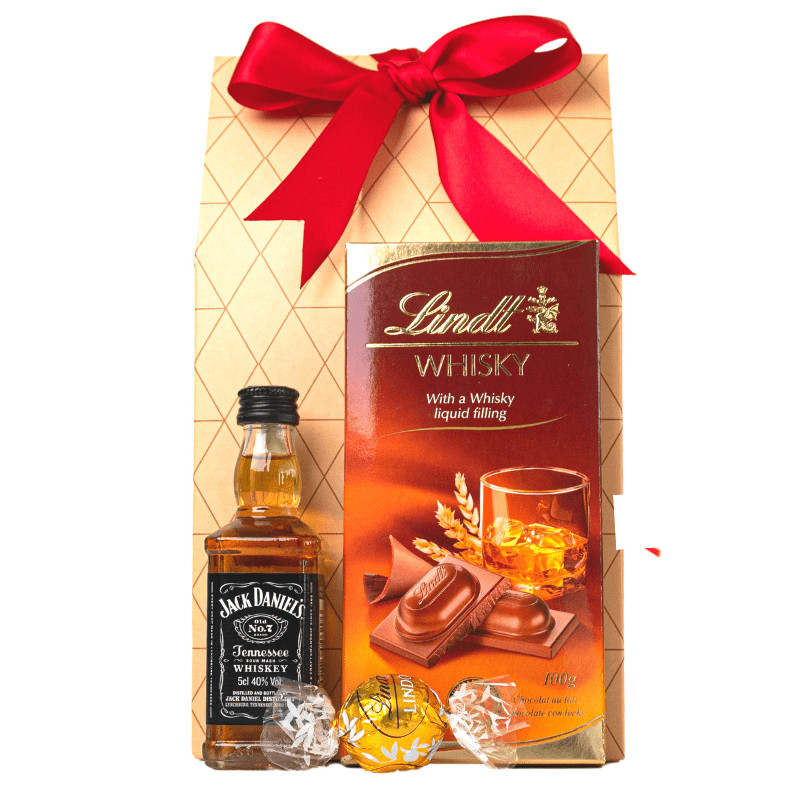 Keresed az ideális ajándékot egy igazi whiskey rajongó számára? Akkor neked ajánljuk "It's a whiskey day" ajándékcsomagunkat! A kézzel összeállított, minőségi termékekből álló csomagban megtalálható a Lindt különleges, whiskey-vel töltött svájci tejcsokoládéja, Jack Daniel's whiskey és lágyan olvadó Lindt fehércsokoládé praliné. A csomag egy gyönyörű nyomott mintás, sátortetős dísztasakban érkezik, amit selyem szalaggal kötöttünk át, hogy az ajándékod még különlegesebb legyen.