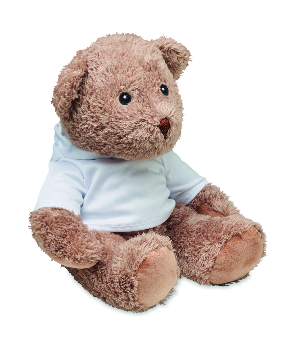 Kapucnis pulóvert viselő nagy plüss mackó. A pulóver ideális szublimációs nyomtatáshoz.