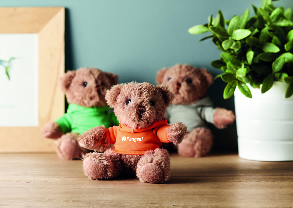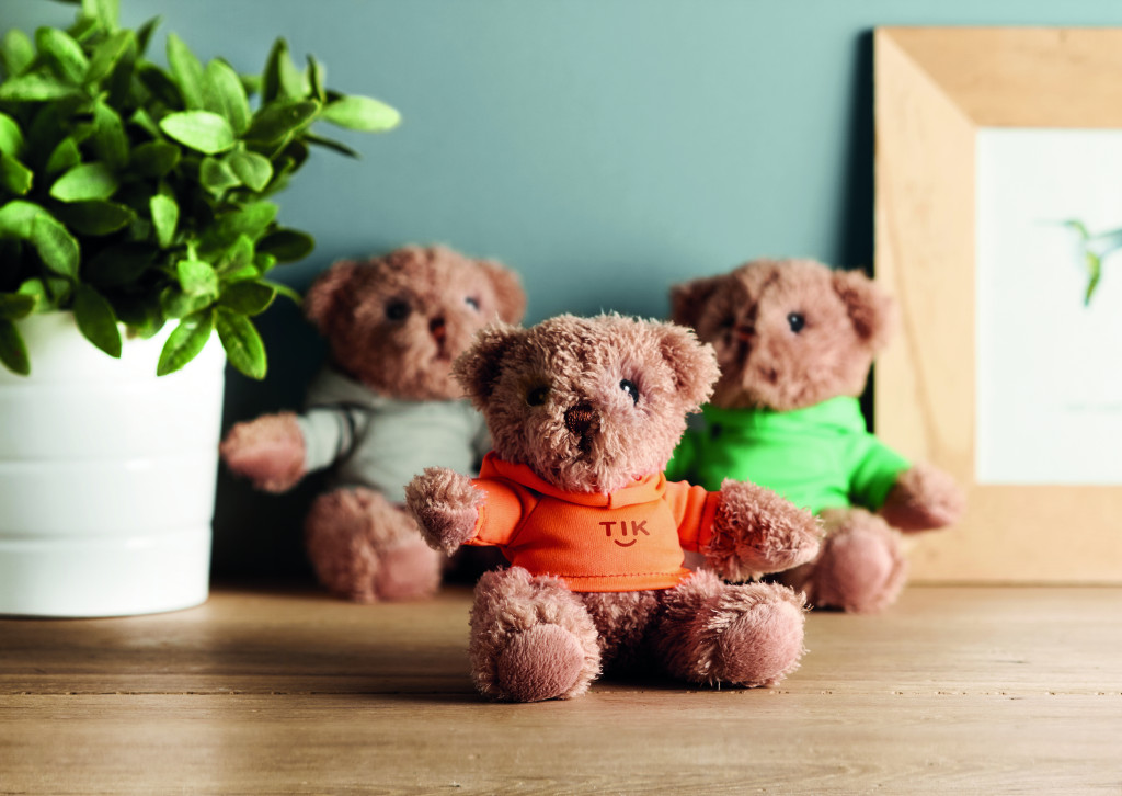 Kapucnis pólót viselő plüss maci. A szublimációs nyomtatás csak a fehér színű terméken érhető el.