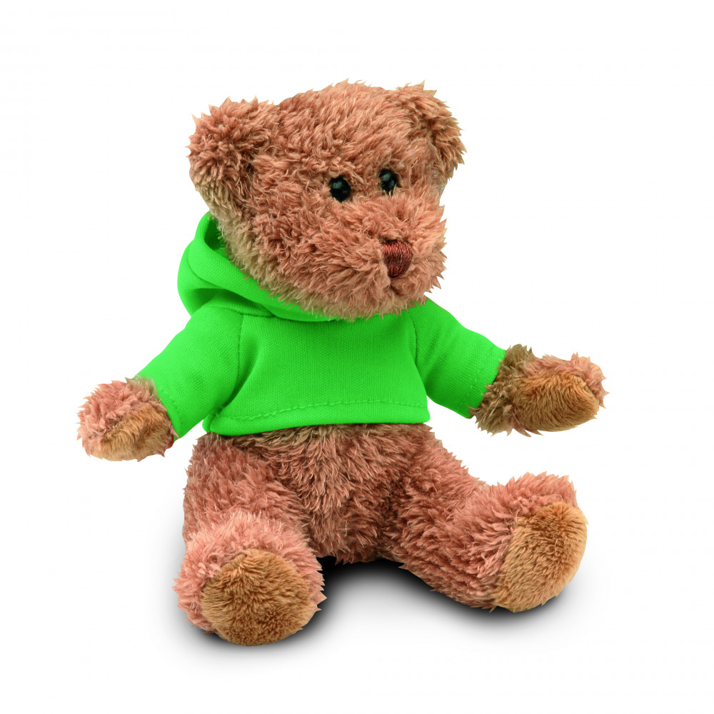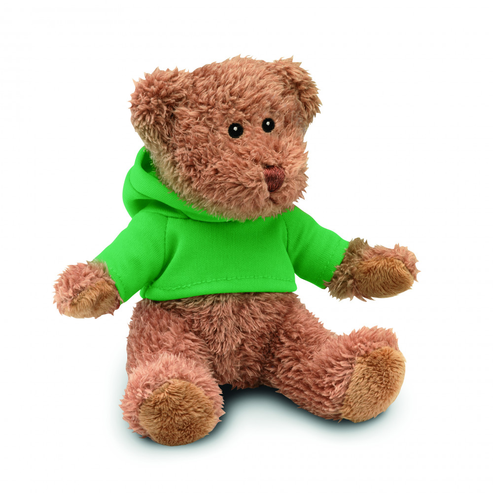 Kapucnis pólót viselő plüss maci. A szublimációs nyomtatás csak a fehér színű terméken érhető el.