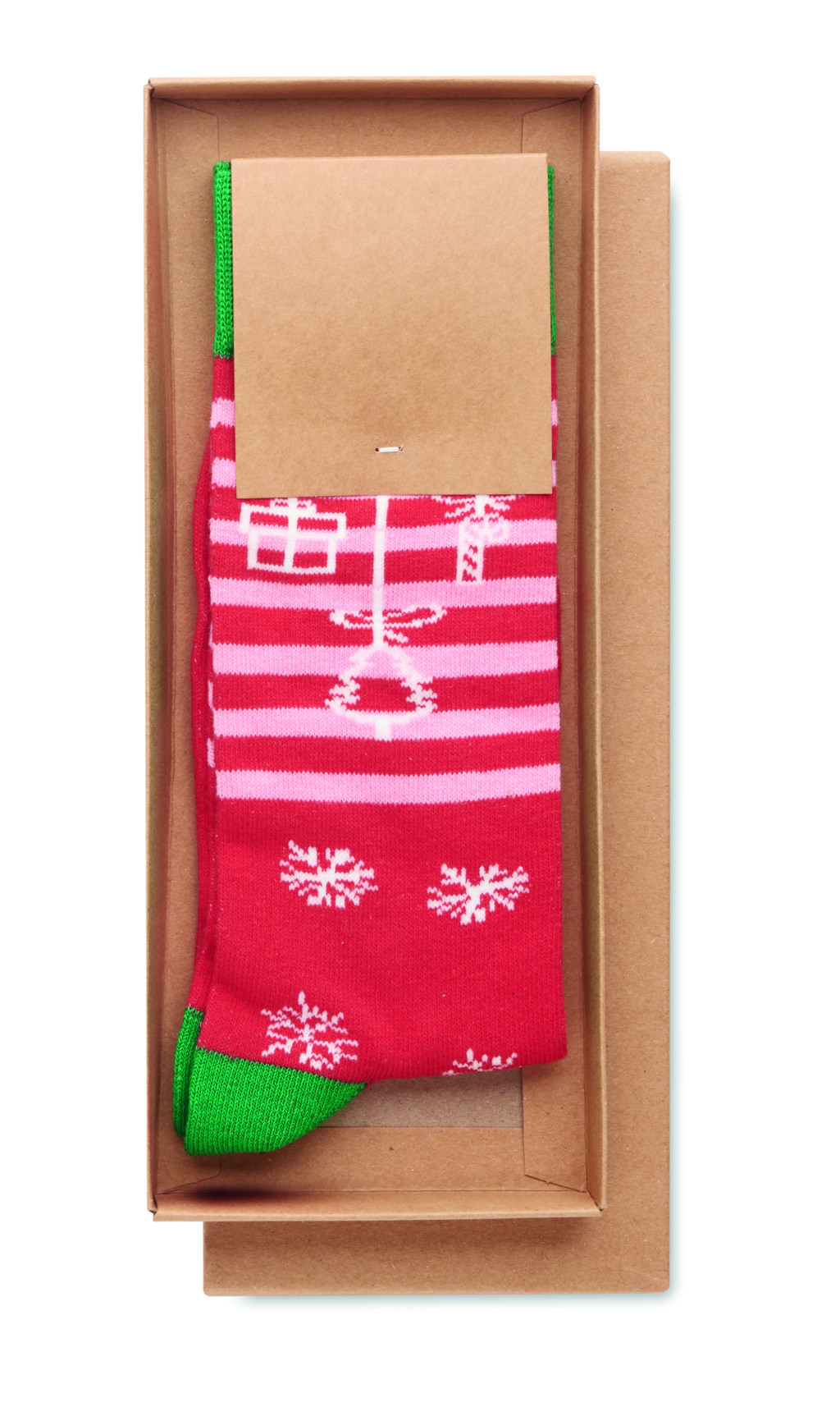 Ünnepi mintás zokni 75% pamut, 23% RPET poliészter és 2% spandex anyagból. Ajándékdobozban. L méret = 43-46.