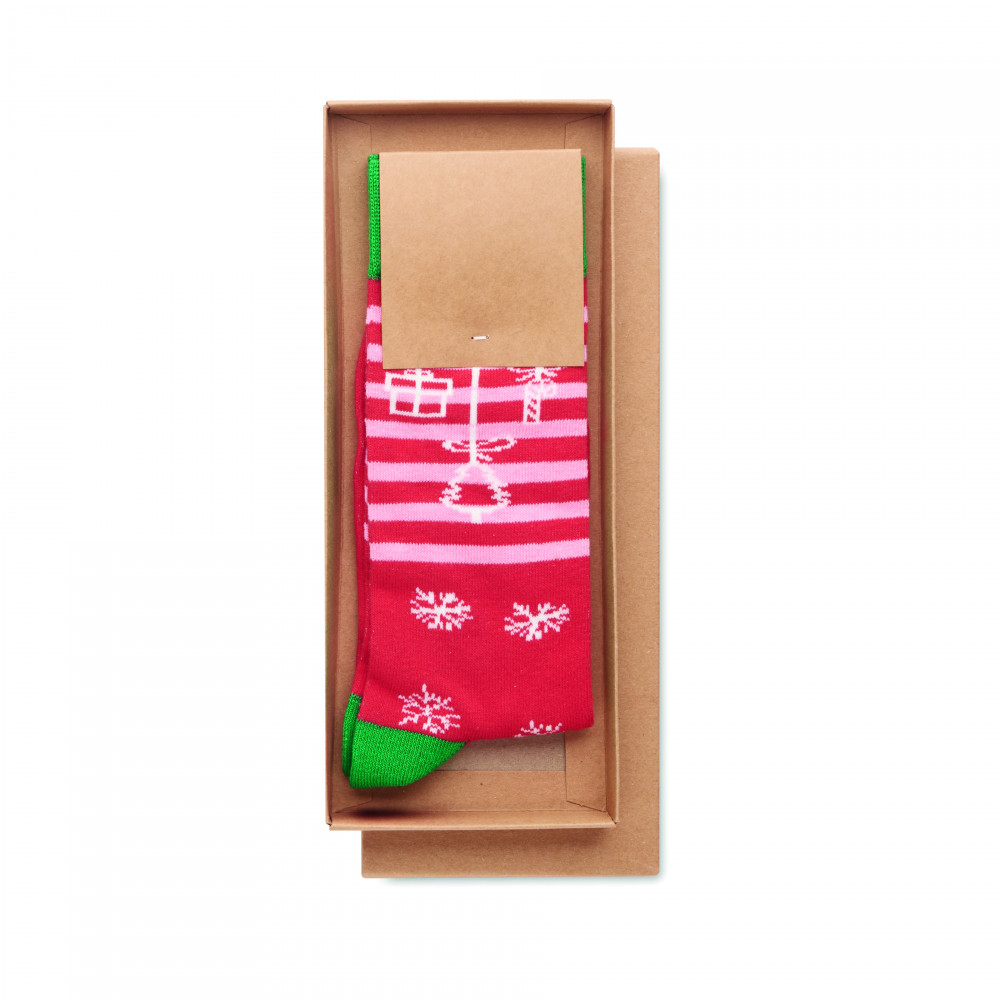 Ünnepi mintás zokni 75% pamut, 23% RPET poliészter és 2% spandex anyagból. Ajándékdobozban. M méret = 38-42.