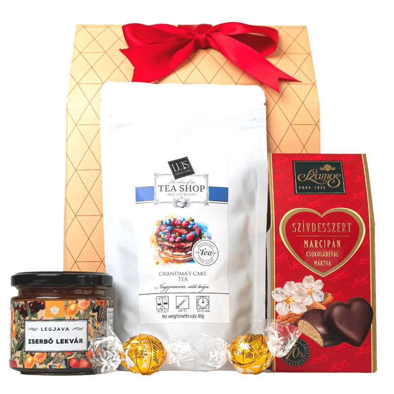 A csomagban található egy mennyei kézműves Zserbó lekvár, egy üveg zamatos "Nagymama süti teája", kényeztető Lindt fehércsokoládé praliné, és egy csomag luxus Szamos desszertmarcipán étcsokoládé köntösben.