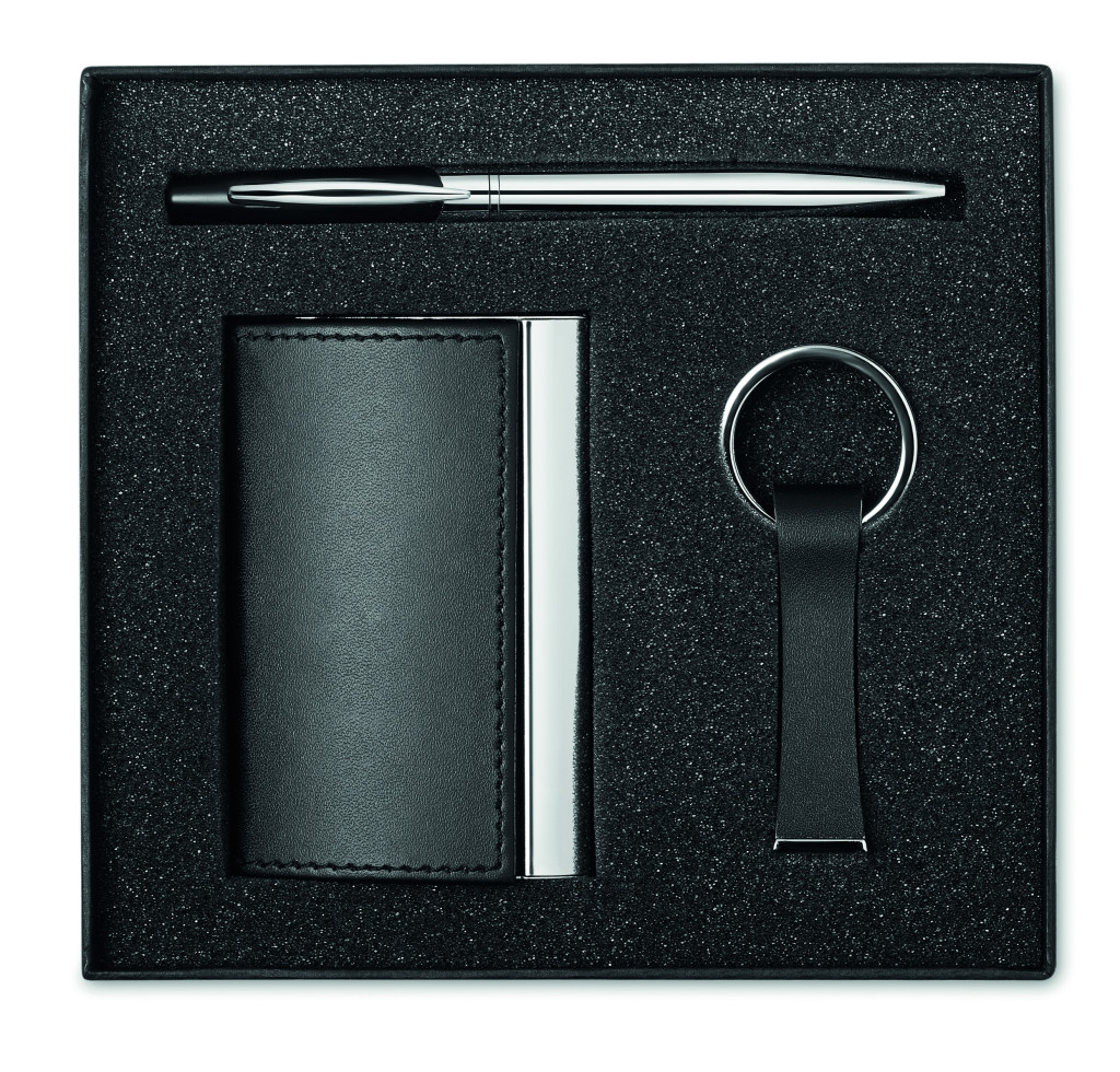 Üzleti ajándék szett dobozban. Tartalma: csavarmechanikás fém golyóstoll feketén író betéttel, rozsdamentes acél és PU kulcstartó, névjegykártya tartó.