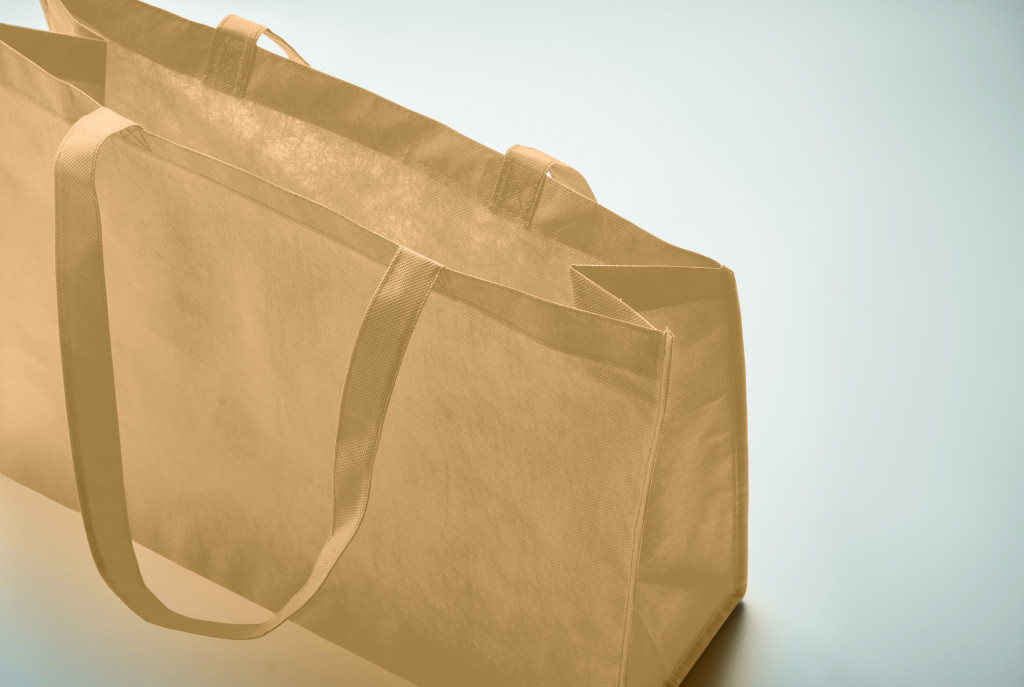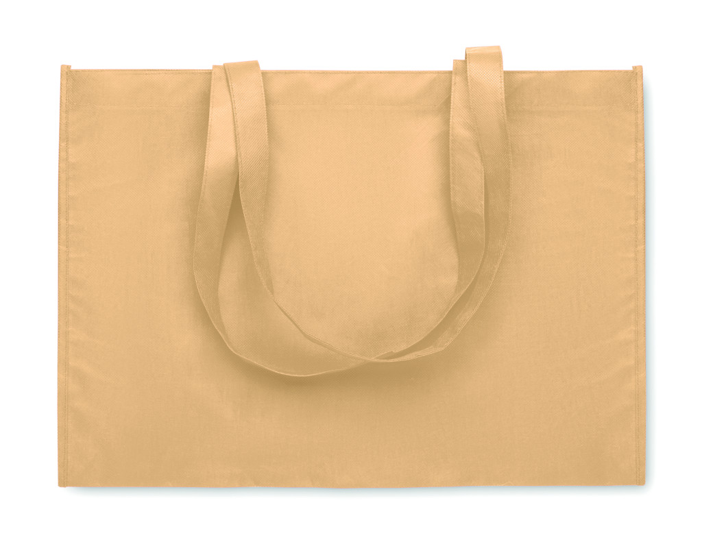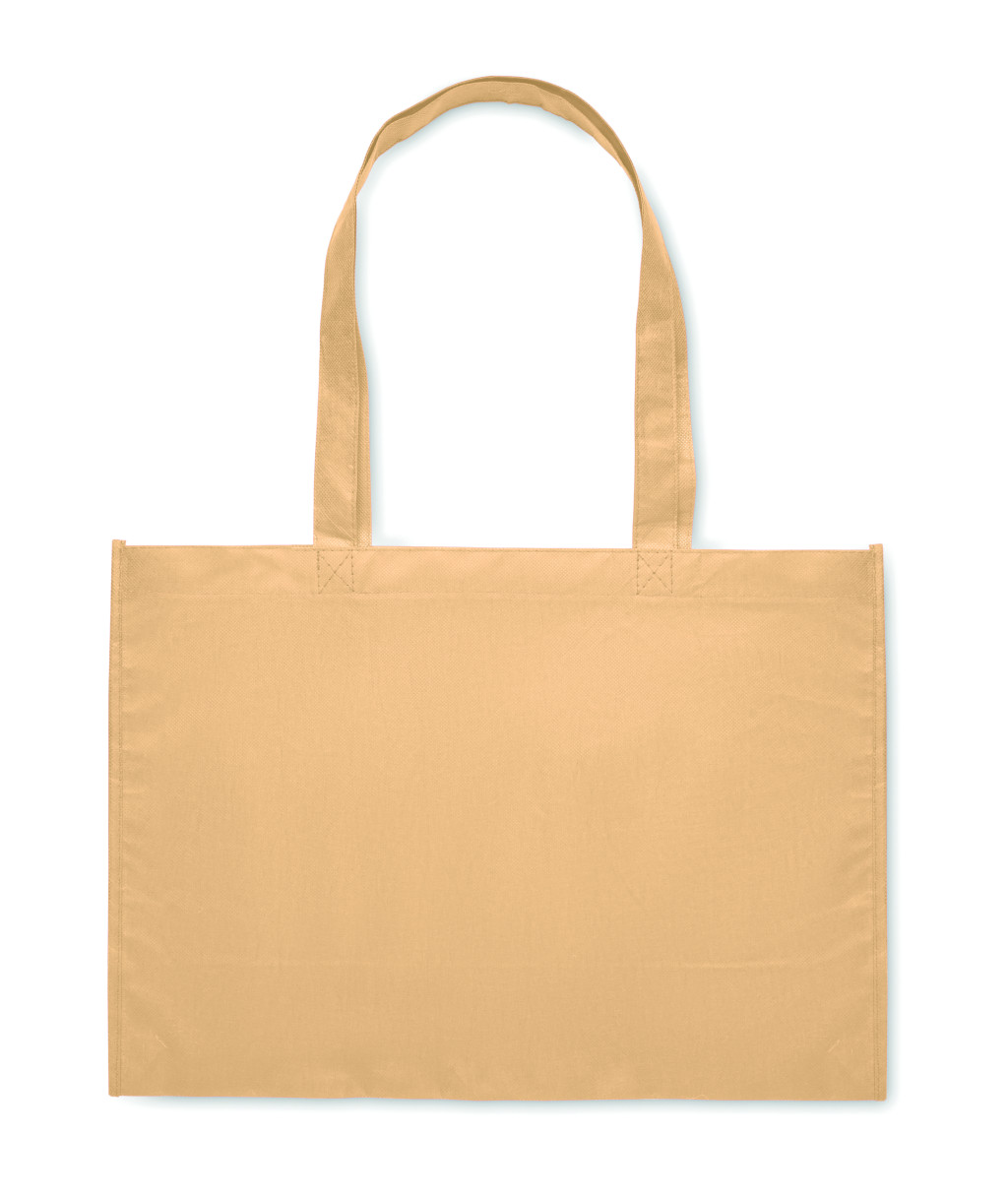 Bevásárló- vagy strandtáska RPET nem szőtt anyagból, oldalsó toldással és hosszú fogantyúval. 80 g/m².