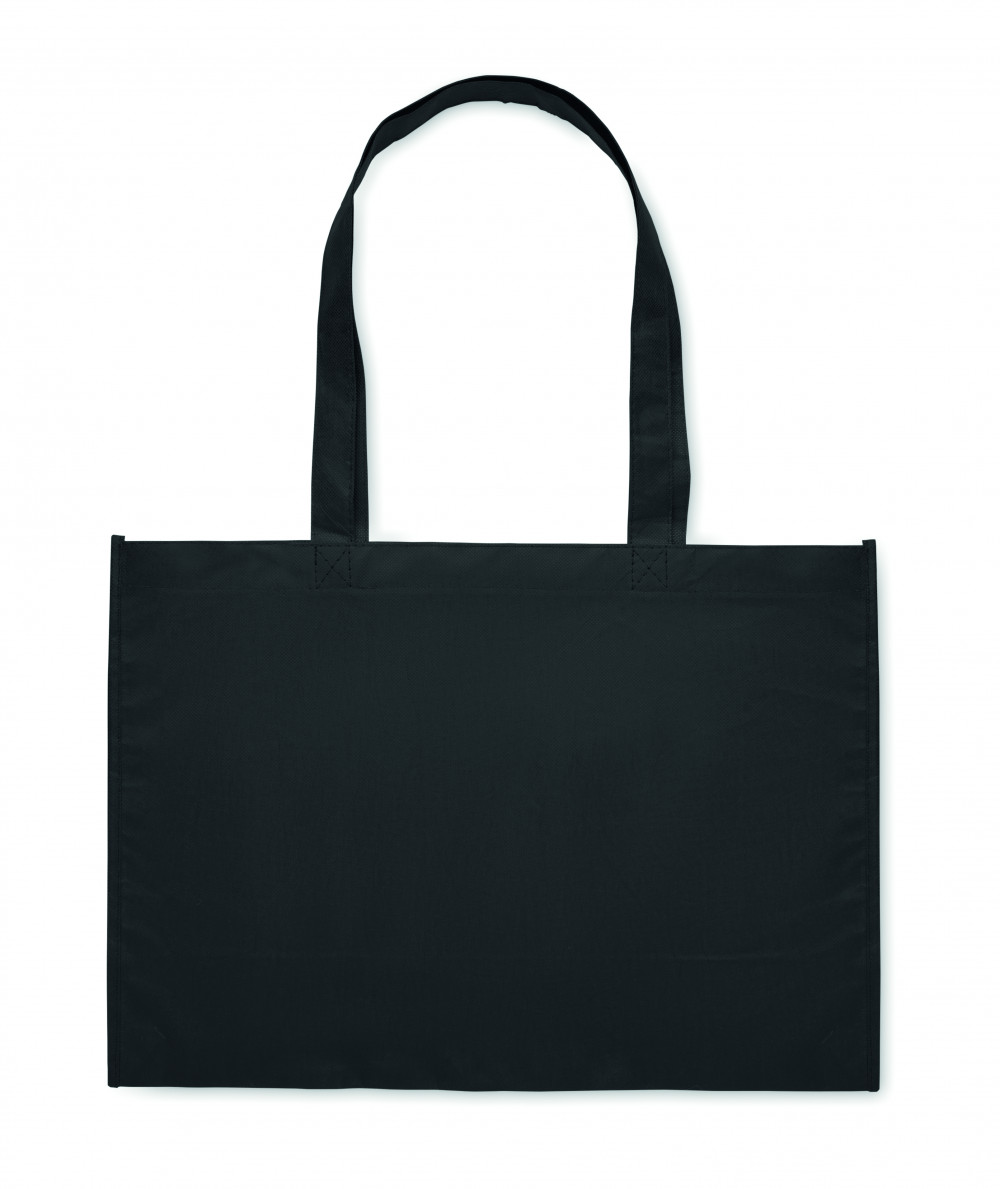 Bevásárló- vagy strandtáska RPET nem szőtt anyagból, oldalsó toldással és hosszú fogantyúval. 80 g/m².
