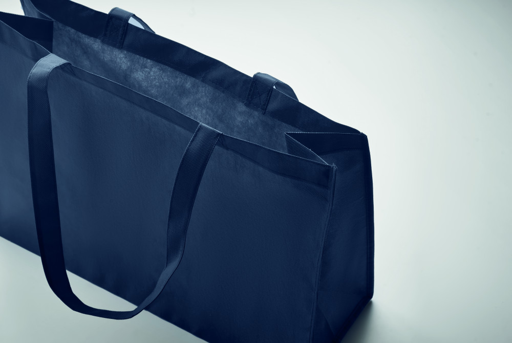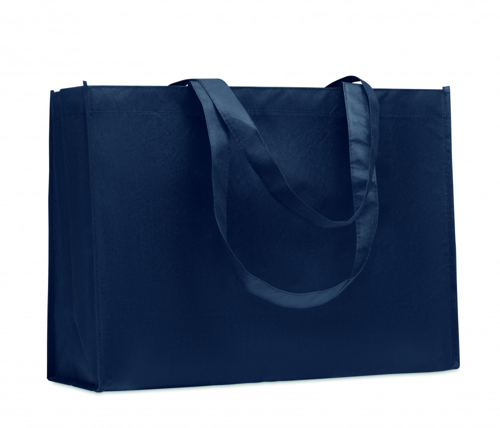 Bevásárló- vagy strandtáska RPET nem szőtt anyagból, oldalsó toldással és hosszú fogantyúval. 80 g/m².