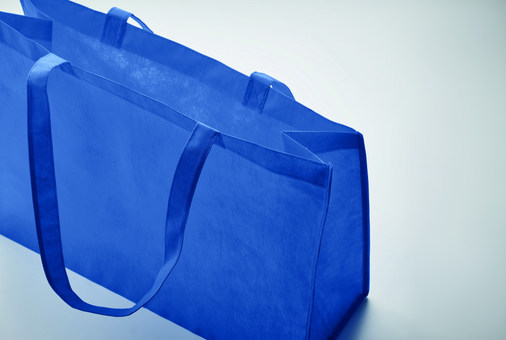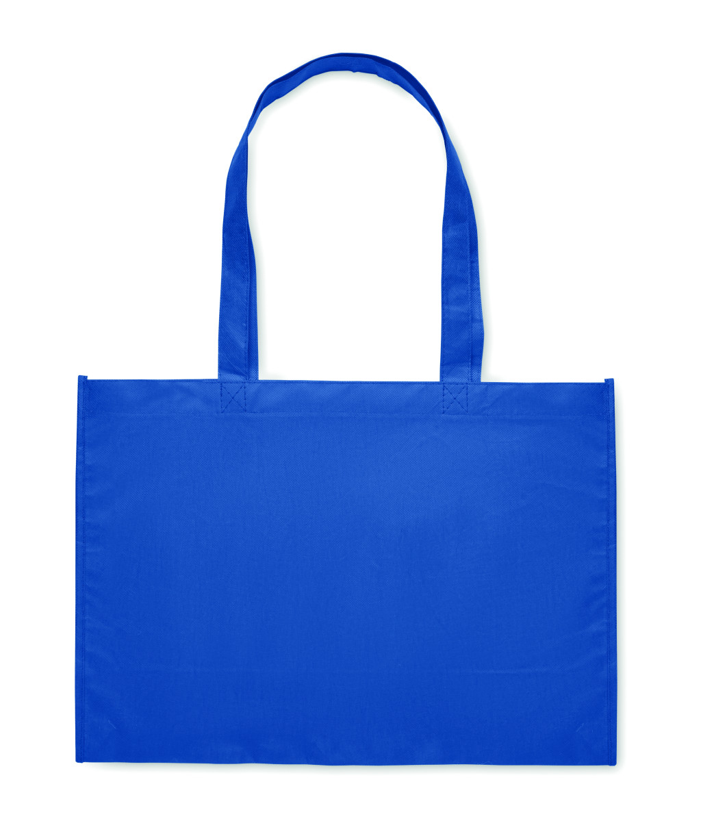 Bevásárló- vagy strandtáska RPET nem szőtt anyagból, oldalsó toldással és hosszú fogantyúval. 80 g/m².