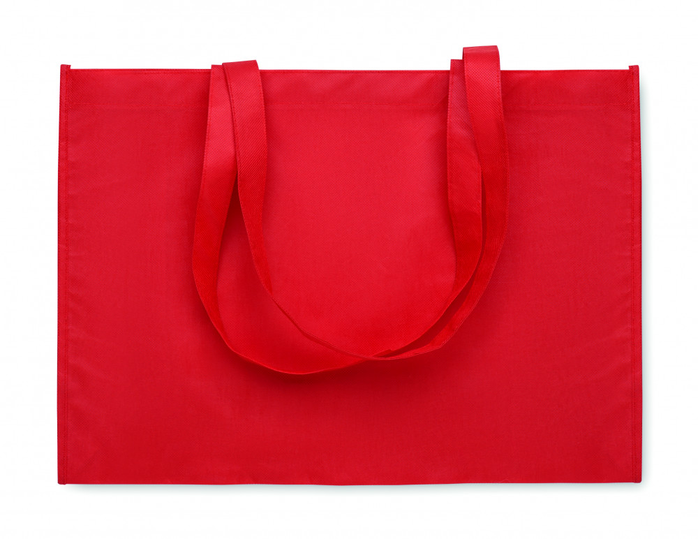 Bevásárló- vagy strandtáska RPET nem szőtt anyagból, oldalsó toldással és hosszú fogantyúval. 80 g/m².