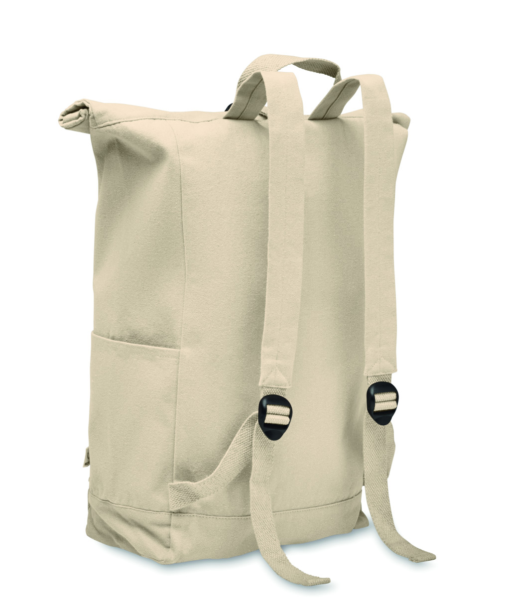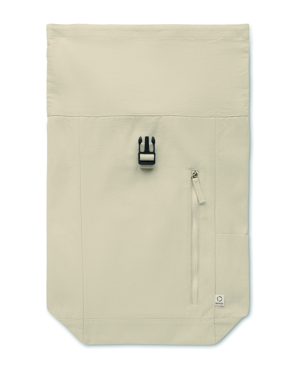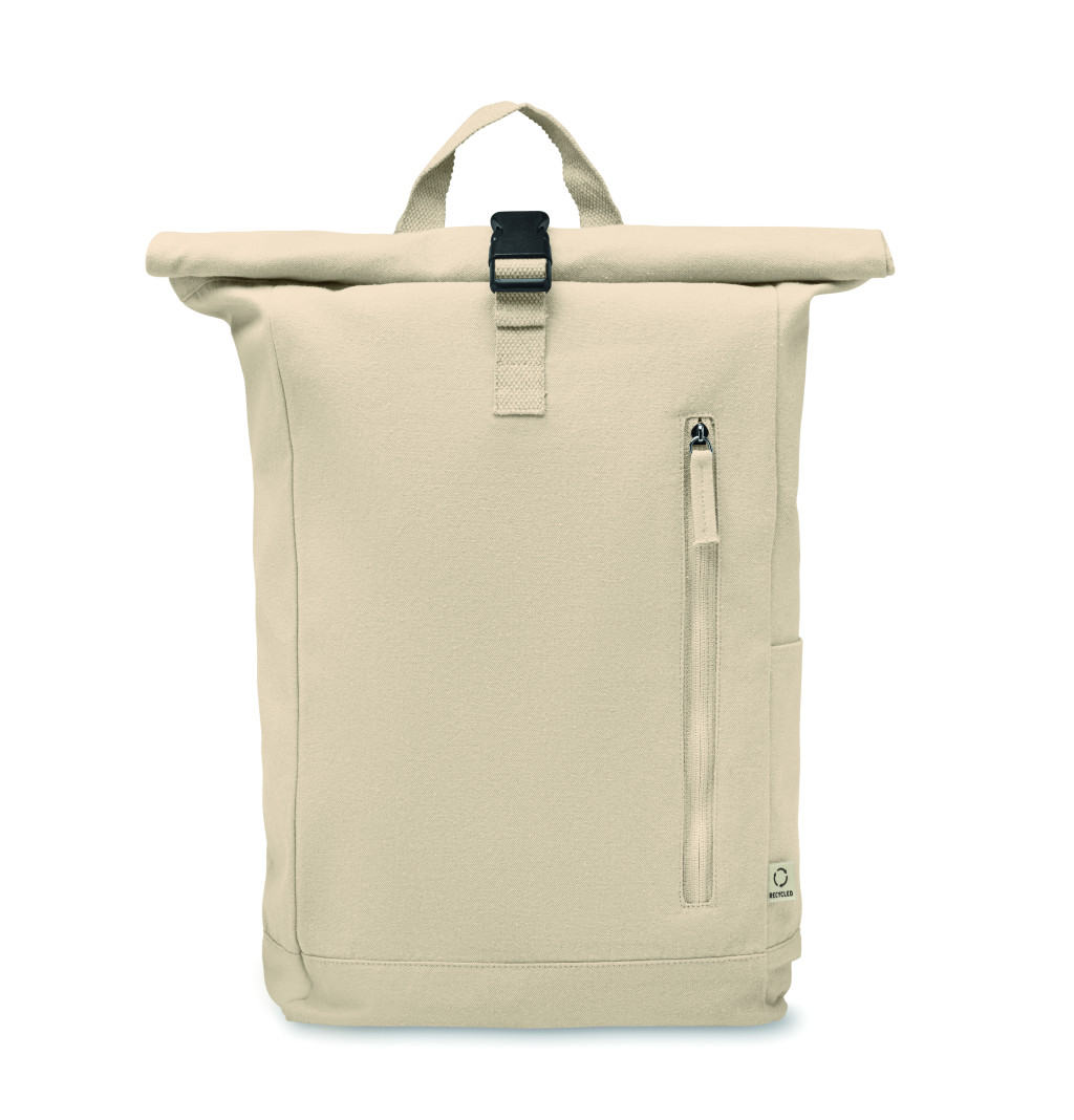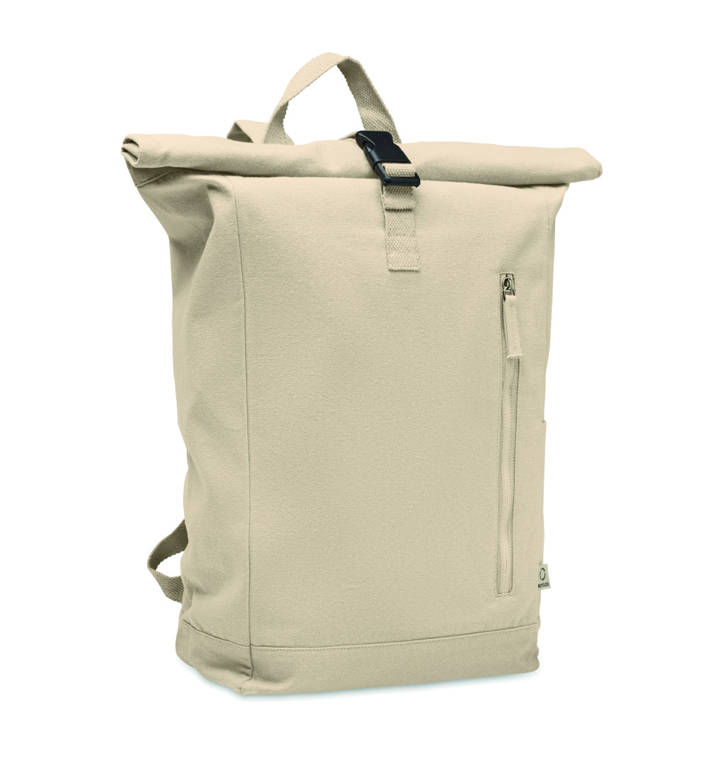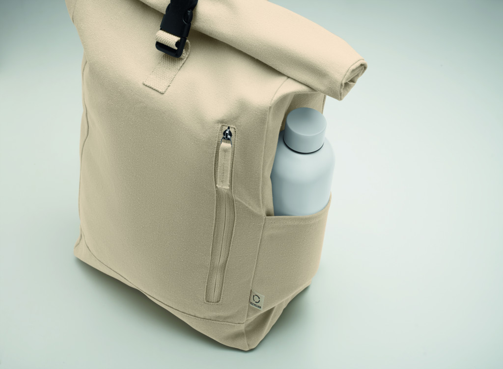 Rolltop csavart záródású hátizsák tépőzárral, 390 g/m² vastag újrahasznosított pamutból (80%) és újrahasznosított poliészterből (20%). Cipzáras elülső zsebbel.