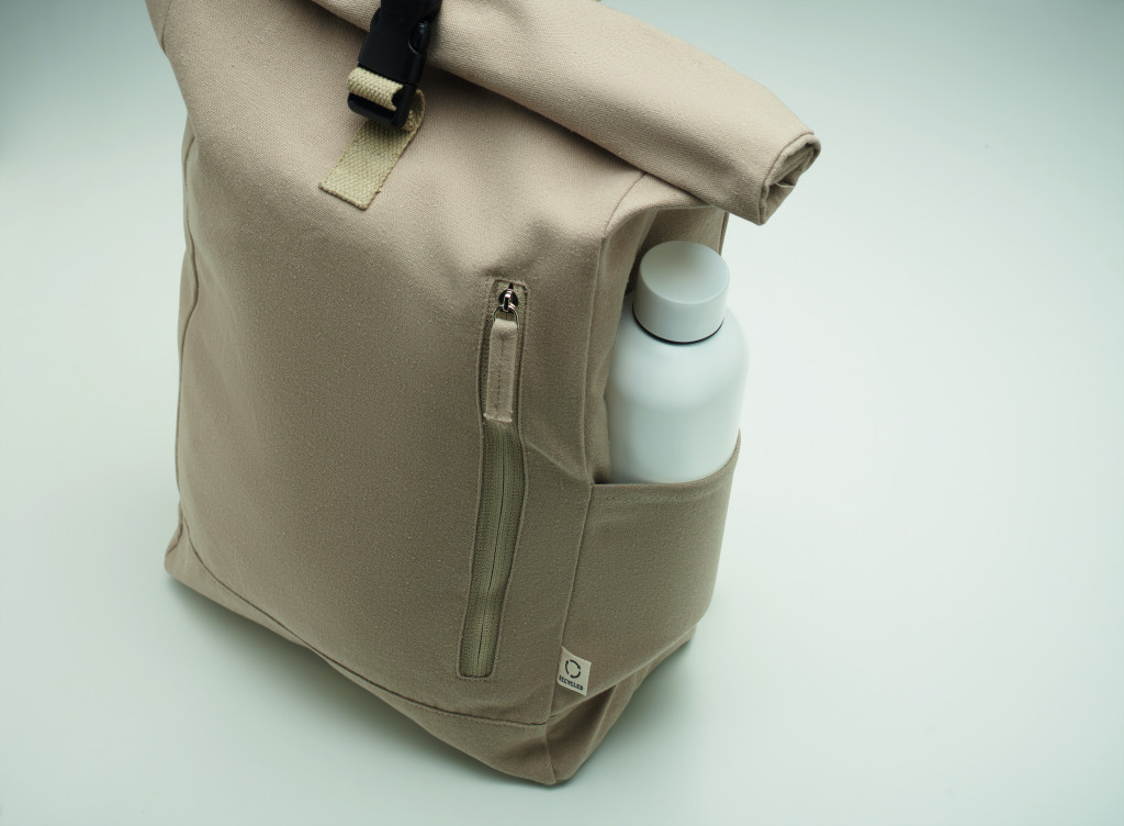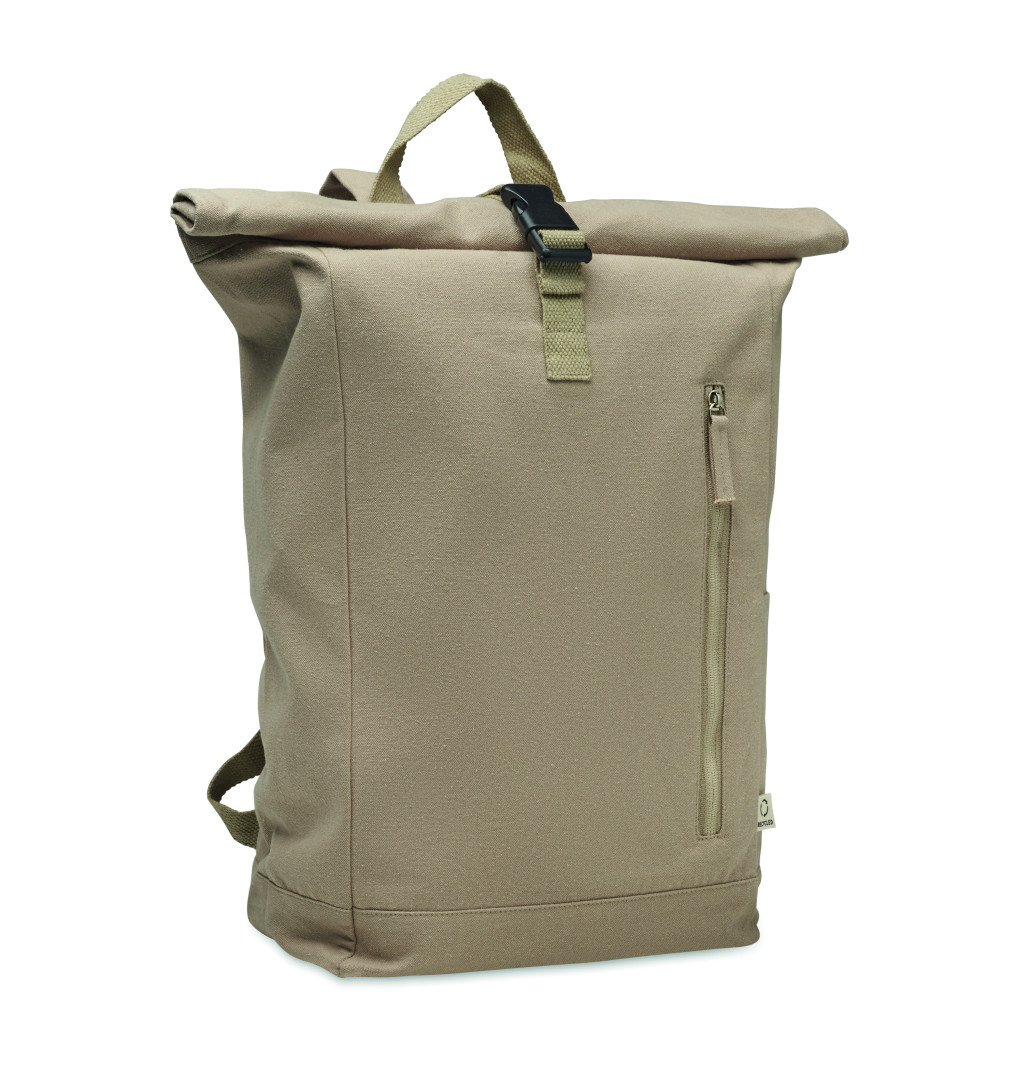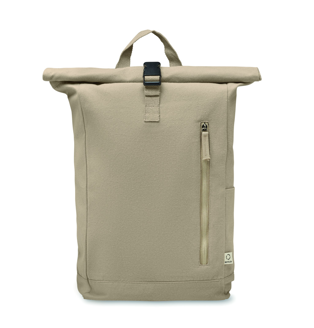 Rolltop csavart záródású hátizsák tépőzárral, 390 g/m² vastag újrahasznosított pamutból (80%) és újrahasznosított poliészterből (20%). Cipzáras elülső zsebbel.