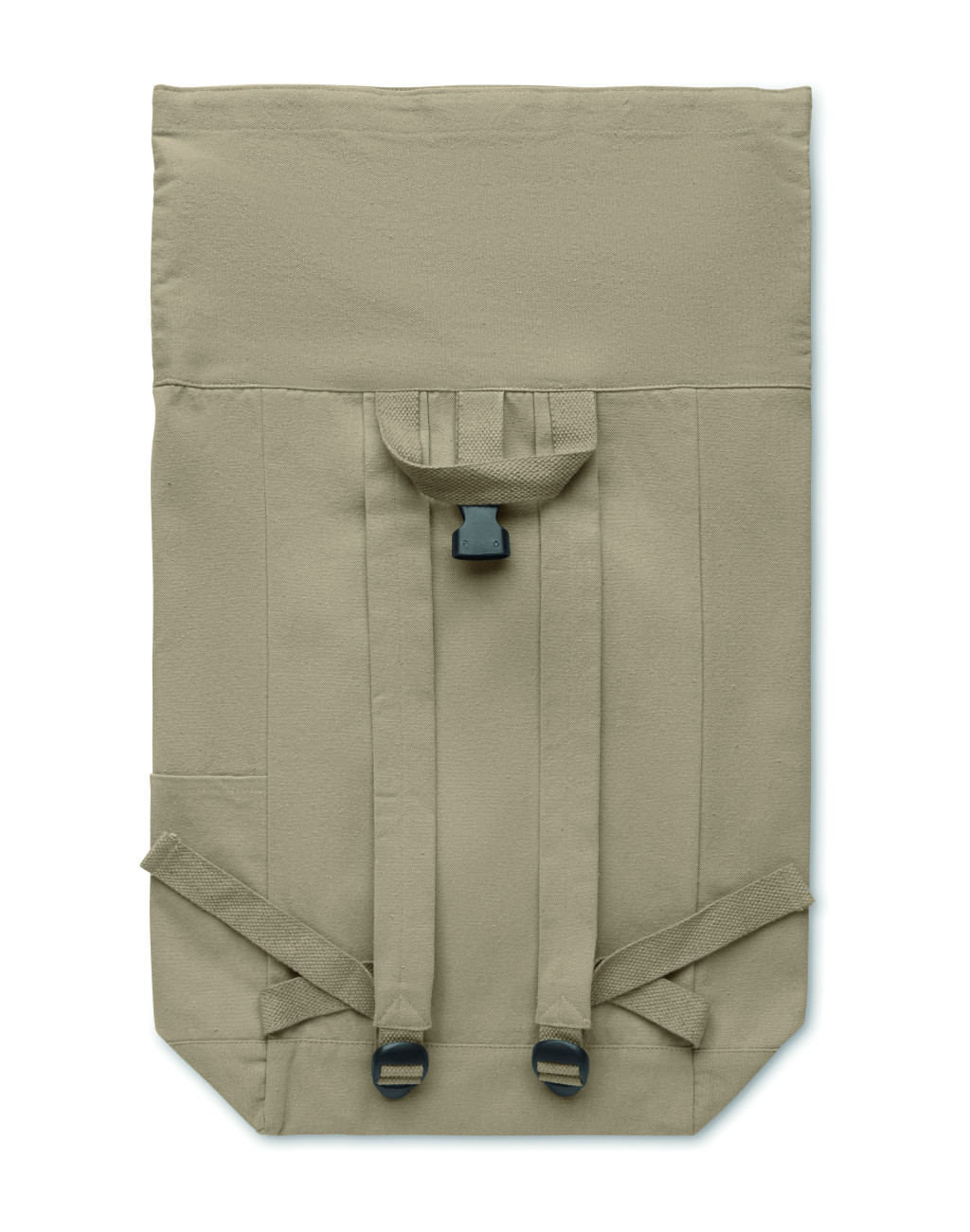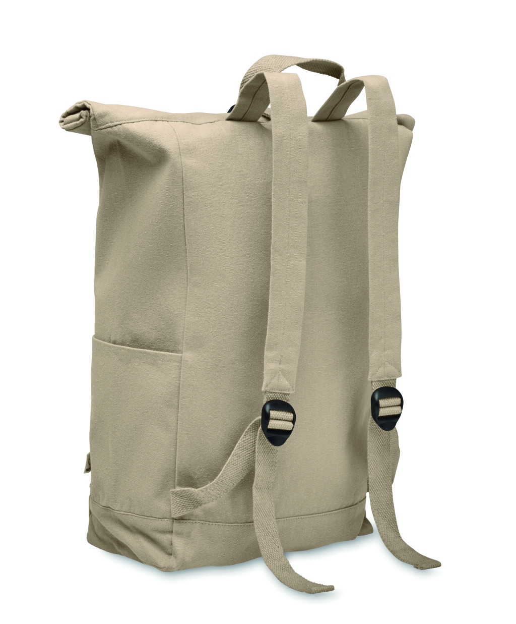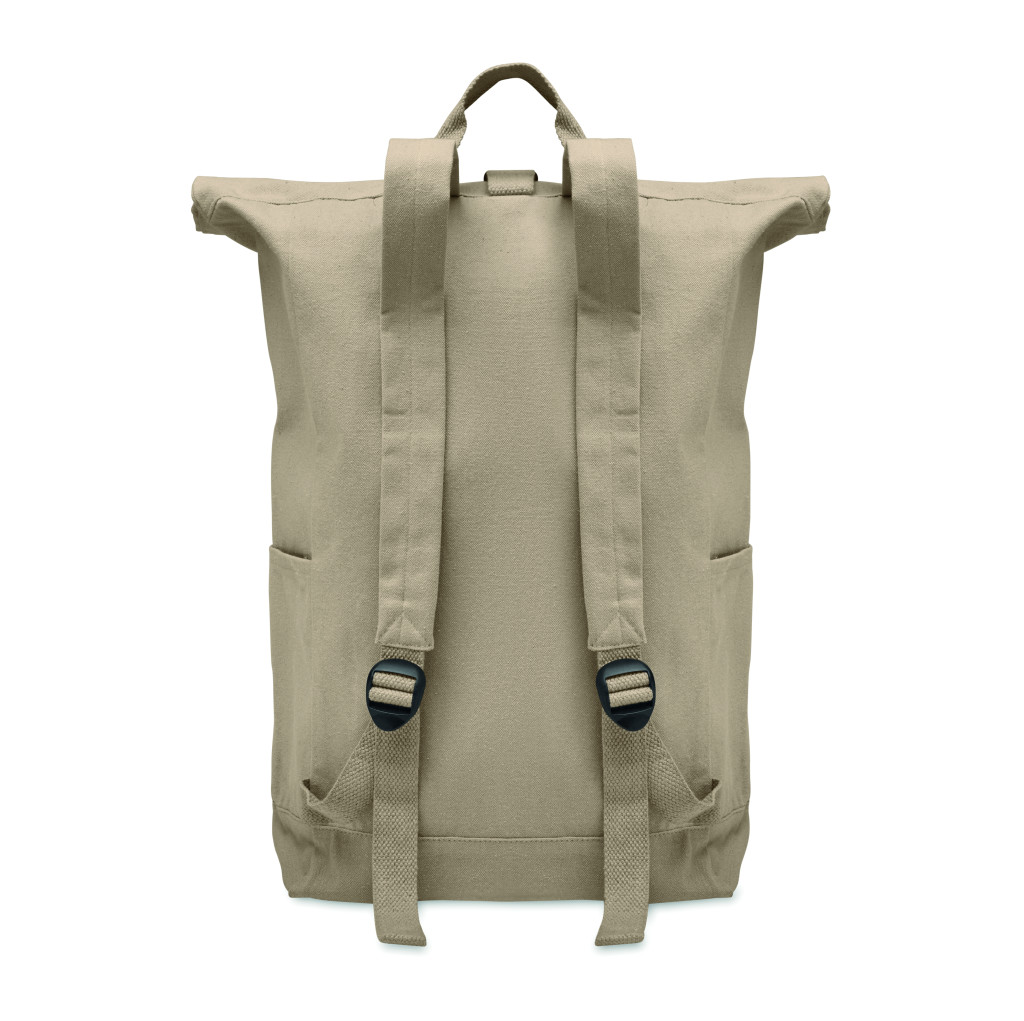 Rolltop csavart záródású hátizsák tépőzárral, 390 g/m² vastag újrahasznosított pamutból (80%) és újrahasznosított poliészterből (20%). Cipzáras elülső zsebbel.