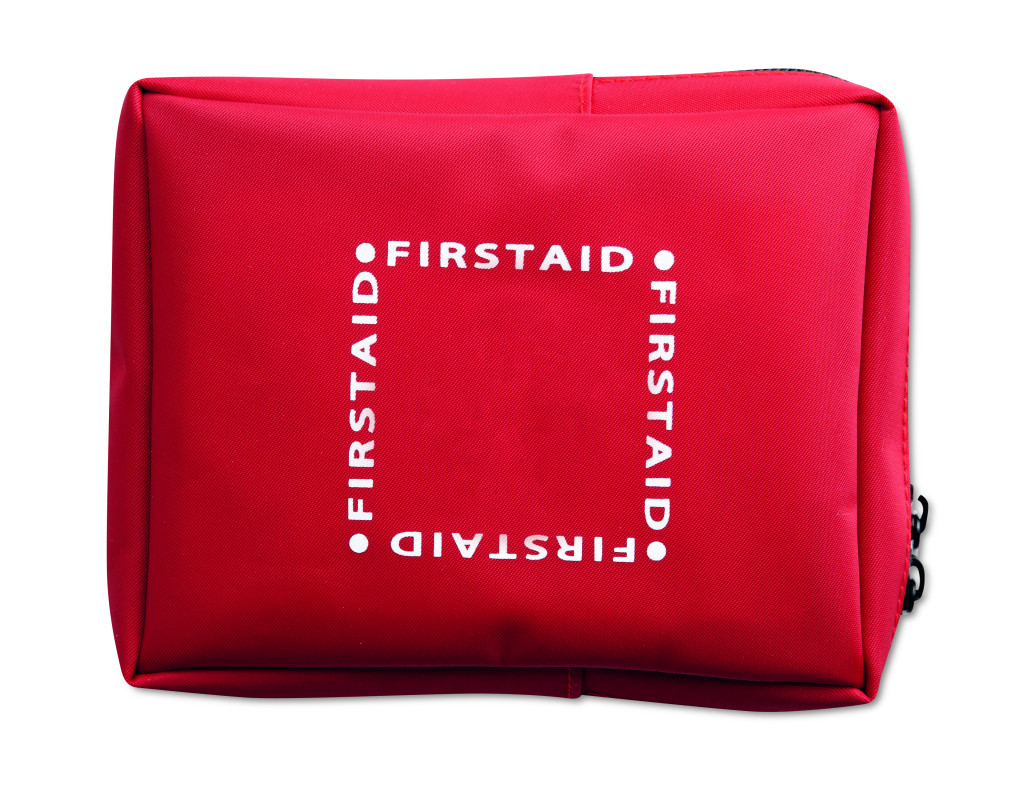 Elsősegély készlet. Tartalma: elsősegély takaró, csipesz, 10 fültisztító pálcika, 1 pár kesztyű, 2 tisztító kendő, 1 öntapadó kötöző szalag, háromszög kötés , 4 sebtapasz, alkoholos törlő, 1 rövid és 1 hosszú kötöző. 230D poliészter övre akasztható tokban.
