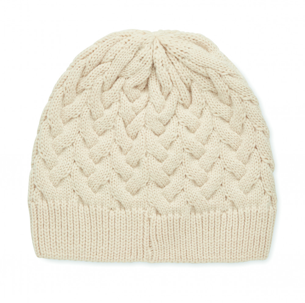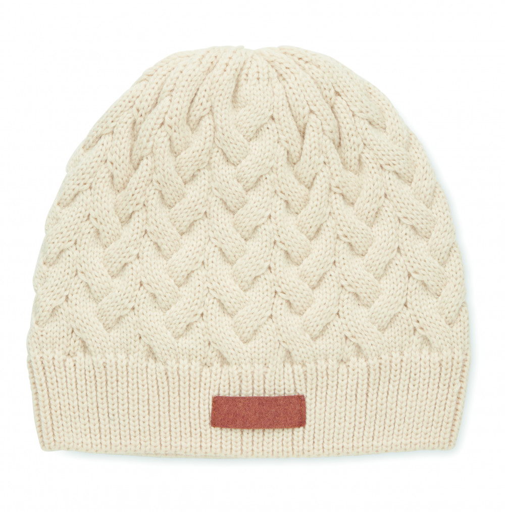 Csavartmintás kötött sapka RPET anyagból, emblémázható címkével.