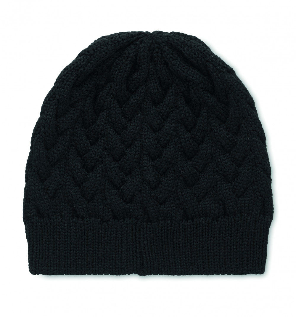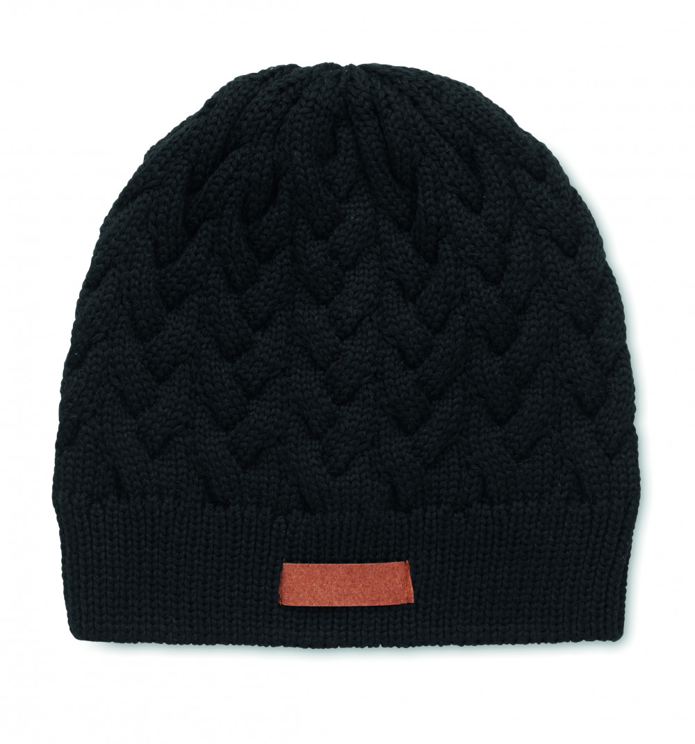 Csavartmintás kötött sapka RPET anyagból, emblémázható címkével.
