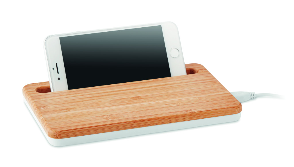 Vezeték nélküli töltő bambusz borítással, USB elosztóval, okostelefon tartóval. USB teljesítmény DC5V/1A (5W), vezeték nélküli teljesítmény DC5V/1A. C típusú csatlakozóval. Qi készülékekhez (újabb Android, iPhone® 8, X, stb.). A bambusz természetes anyag, színében, mintázatában és méretében esetenként eltérő lehet.