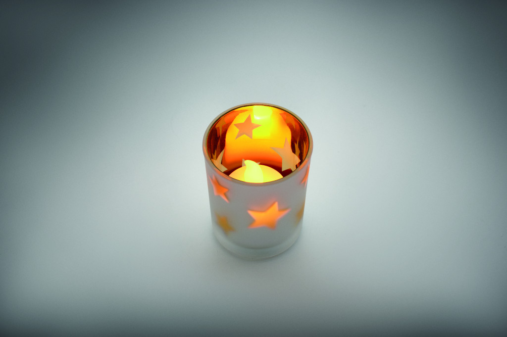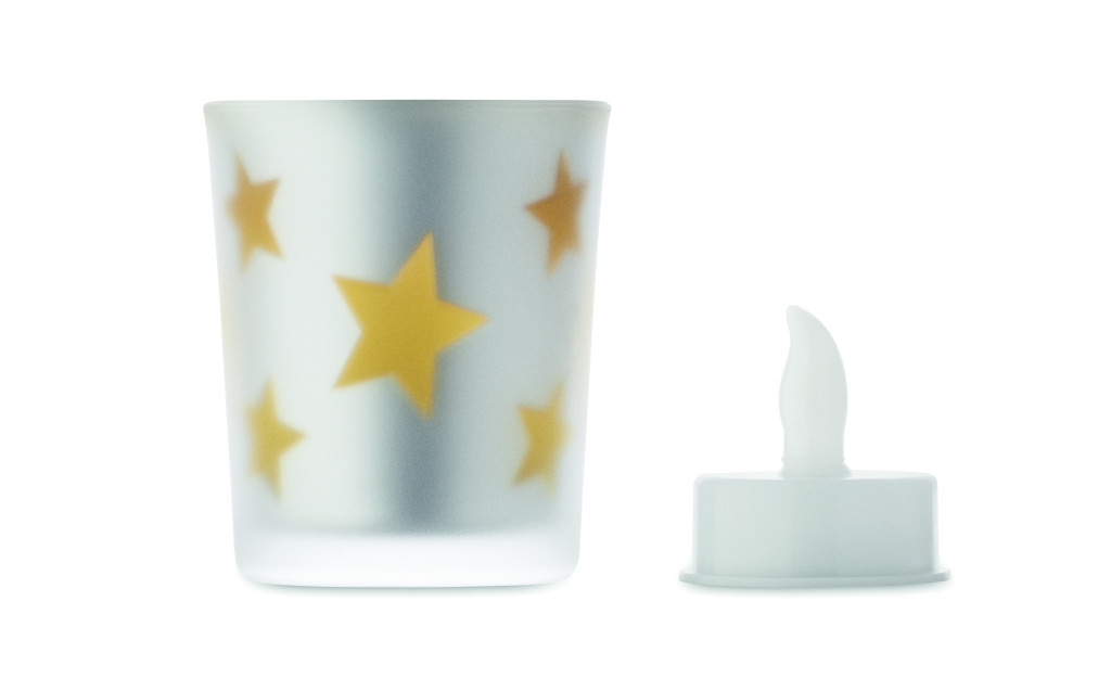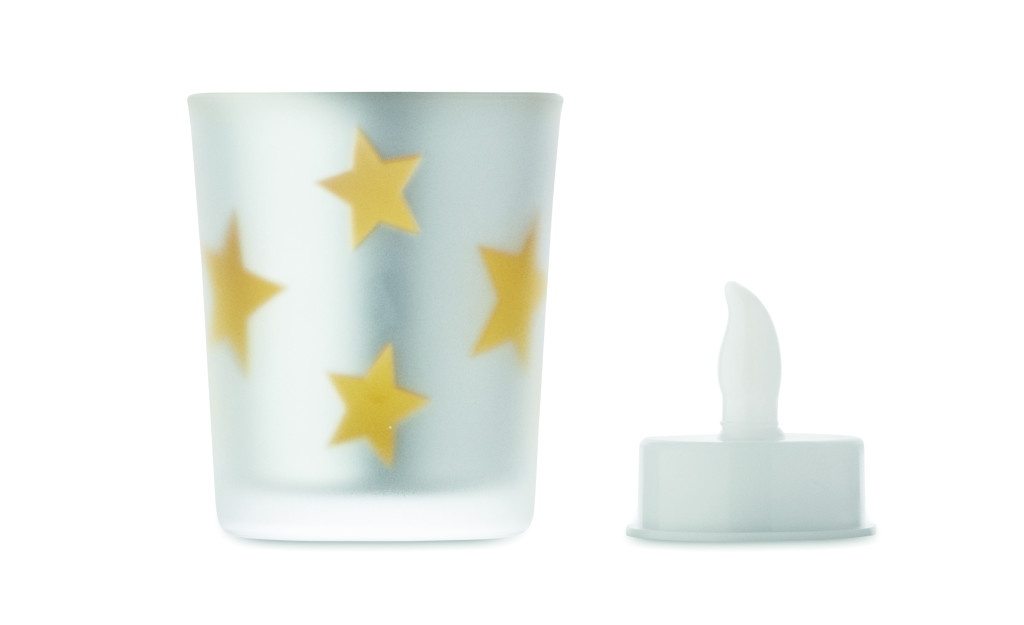 LED mécses PP-ből, üveg tartóban. A működéshez szükséges 1 db CR2032 elemmel szállítjuk.