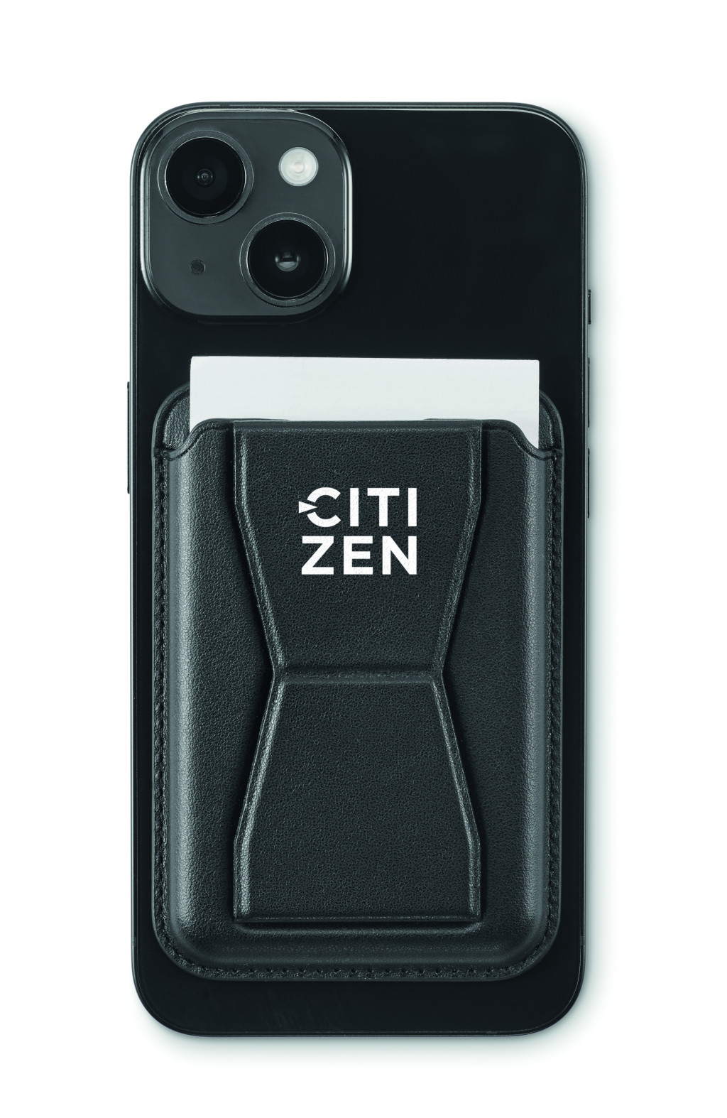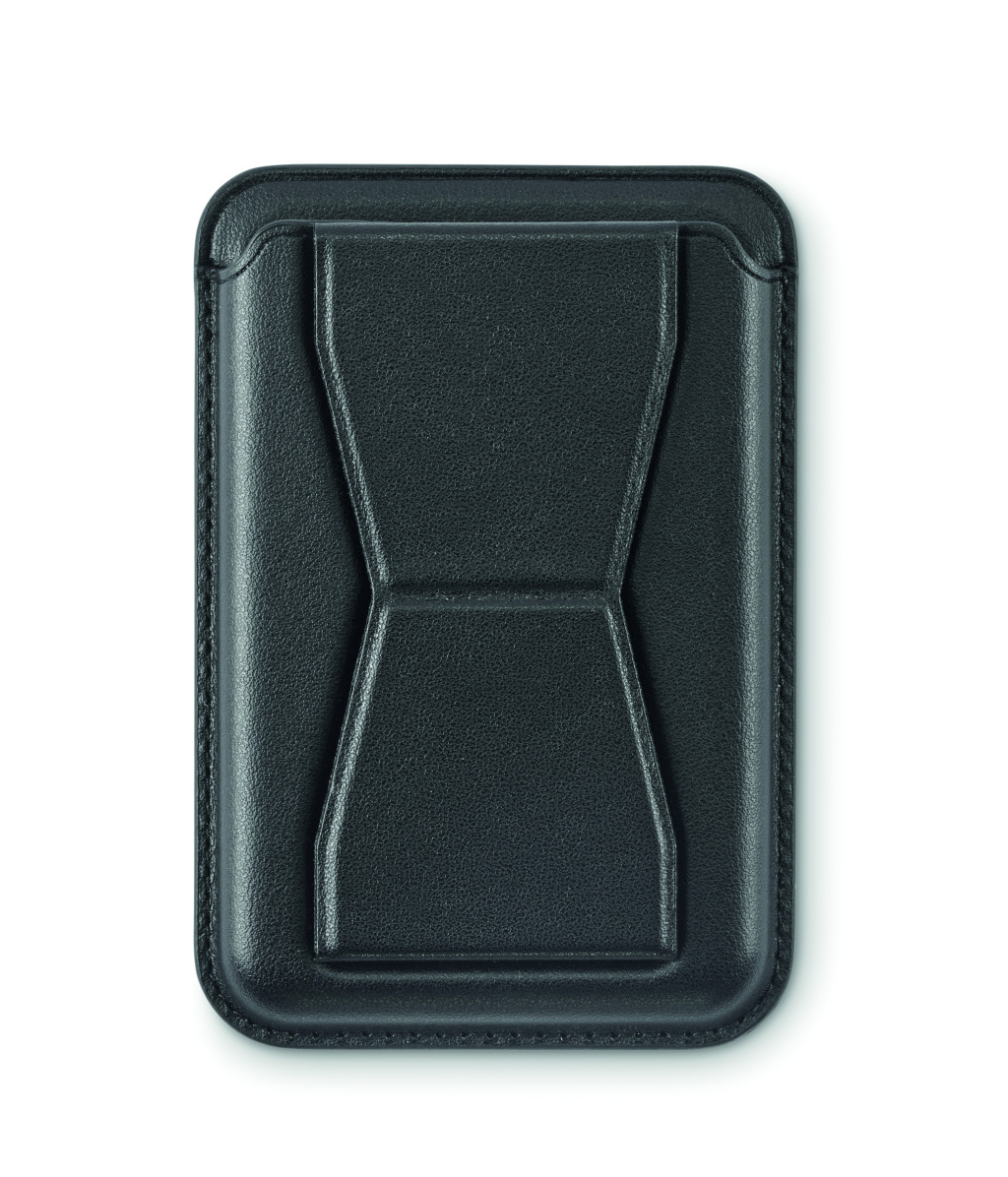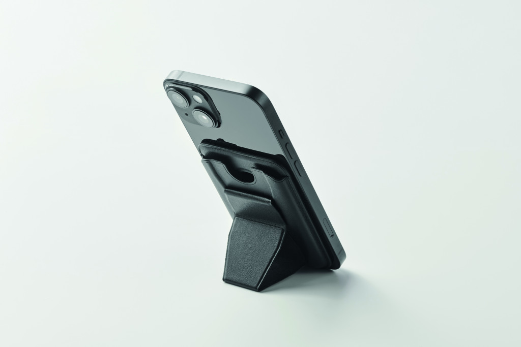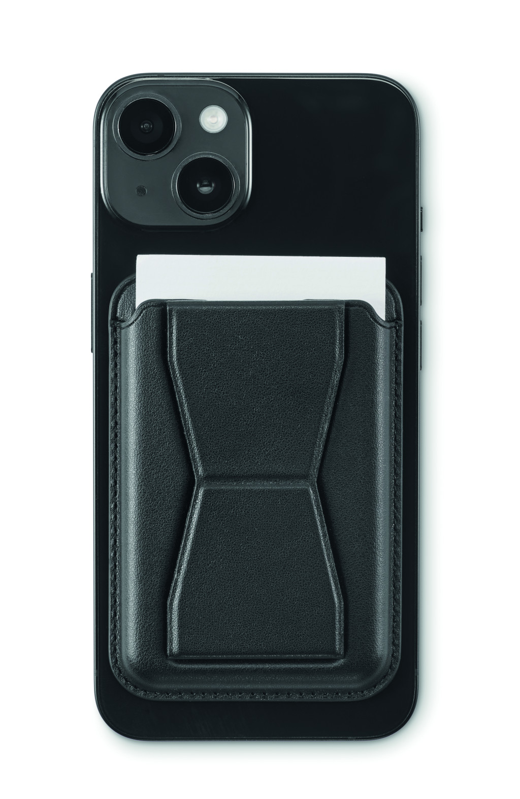 PU bőr, telefonra rögzíthető kártyatartó két kártya számára, telefon állvány funkcióval, mágneses záródással. Kompatibilis az iPhone® 12 és újabb készülékekkel. Mágneses fémgyűrűvel, amely támogatja a nem mágneses telefonokkal való használatot.
