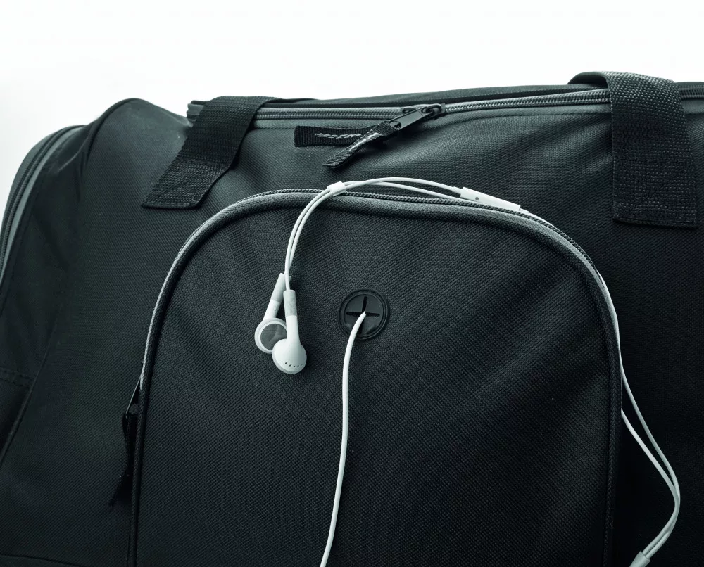 Sporttáska 600D poliészter anyagból. 2 cipzáras oldalsó rekesz és egy cipzáras elülső zseb fülhallgató kimeneti nyílással. Állítható és levehető vállpánt.
