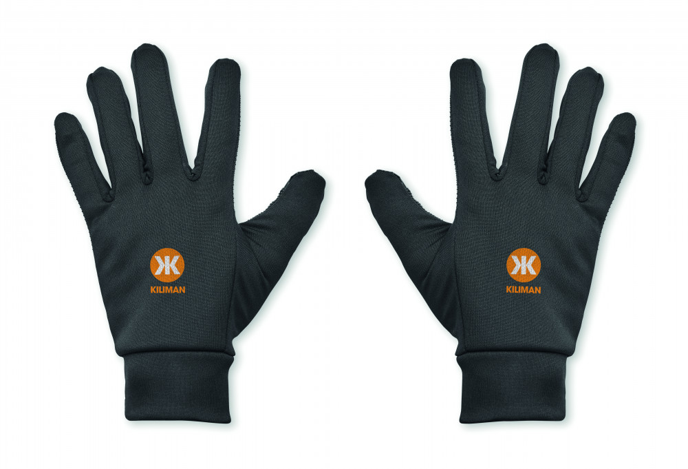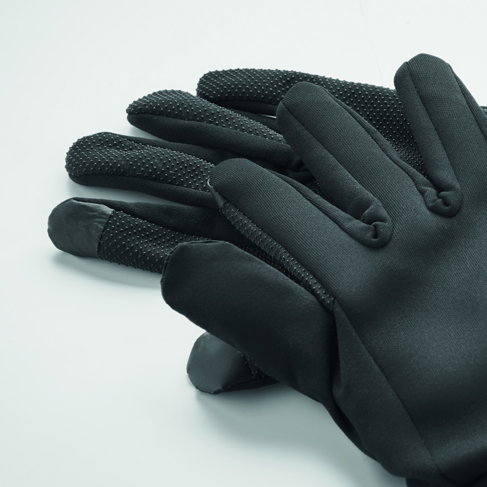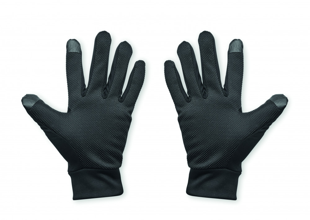 Kapacitív sportkesztyű okostelefonhoz, poliészterből. Két ujj érintésérzékeny funkcióval, a tenyér és az ujjak PVC csúszásgátló részletekkel rendelkeznek.