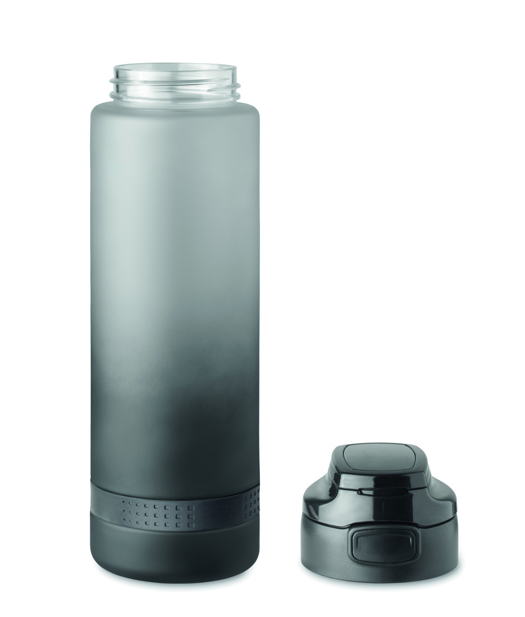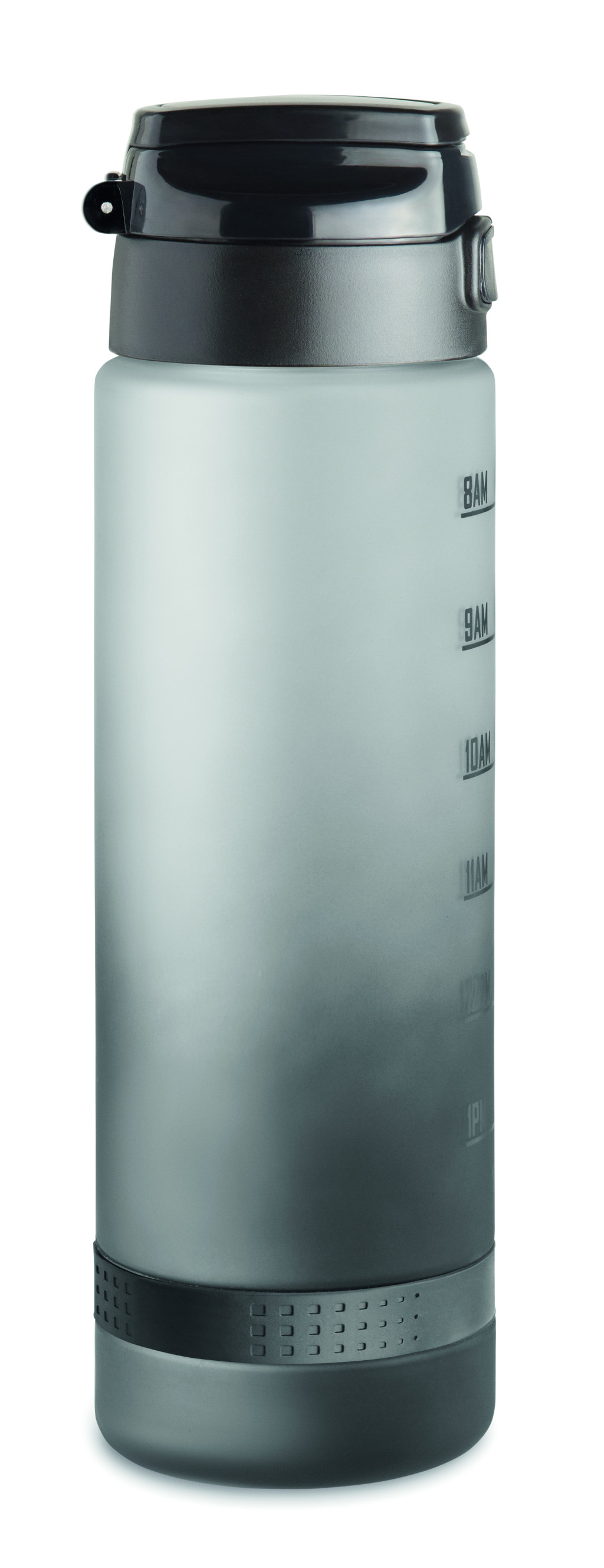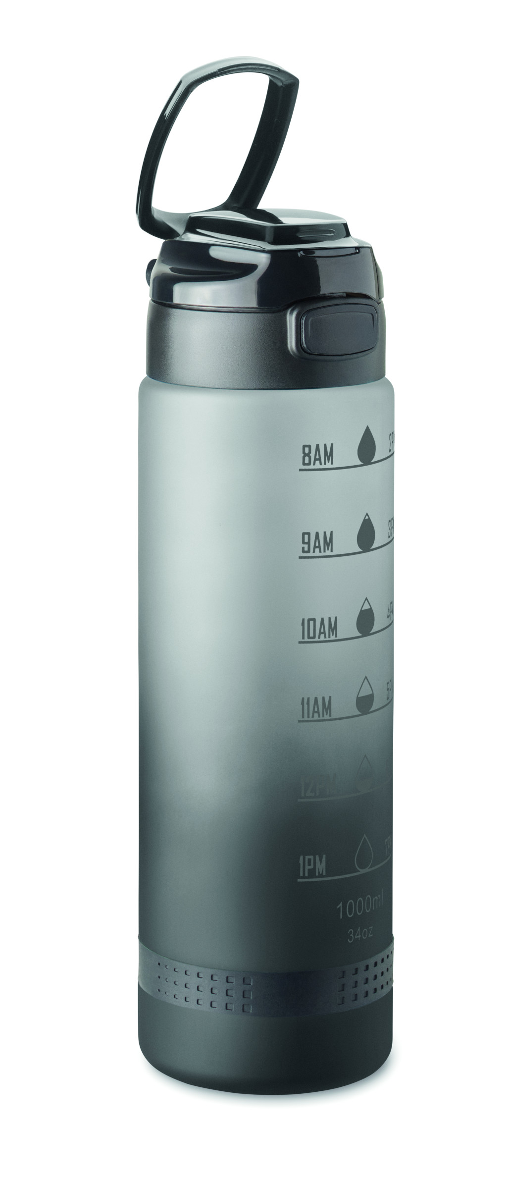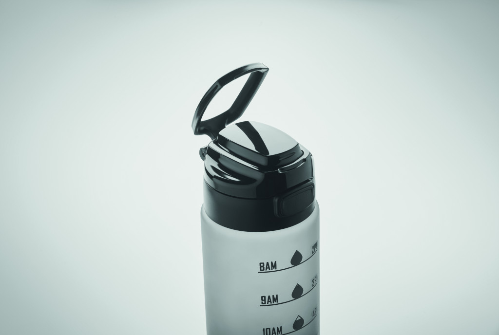 Sportkulacs RPET-ből, motivációs időjelzéssel, egy kézzel nyitható, felpattintható fedéllel, biztonsági zárral és hordfüllel. Szivárgásmentes. Űrtartalom: 1 liter.