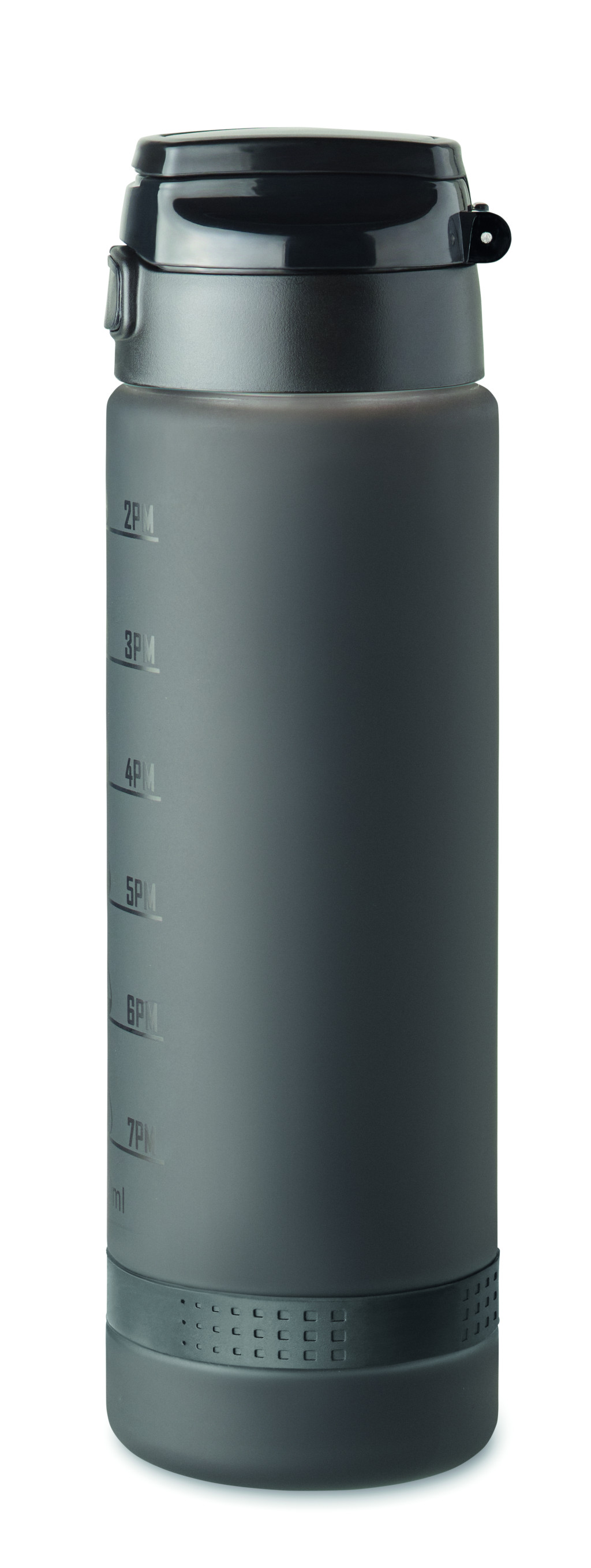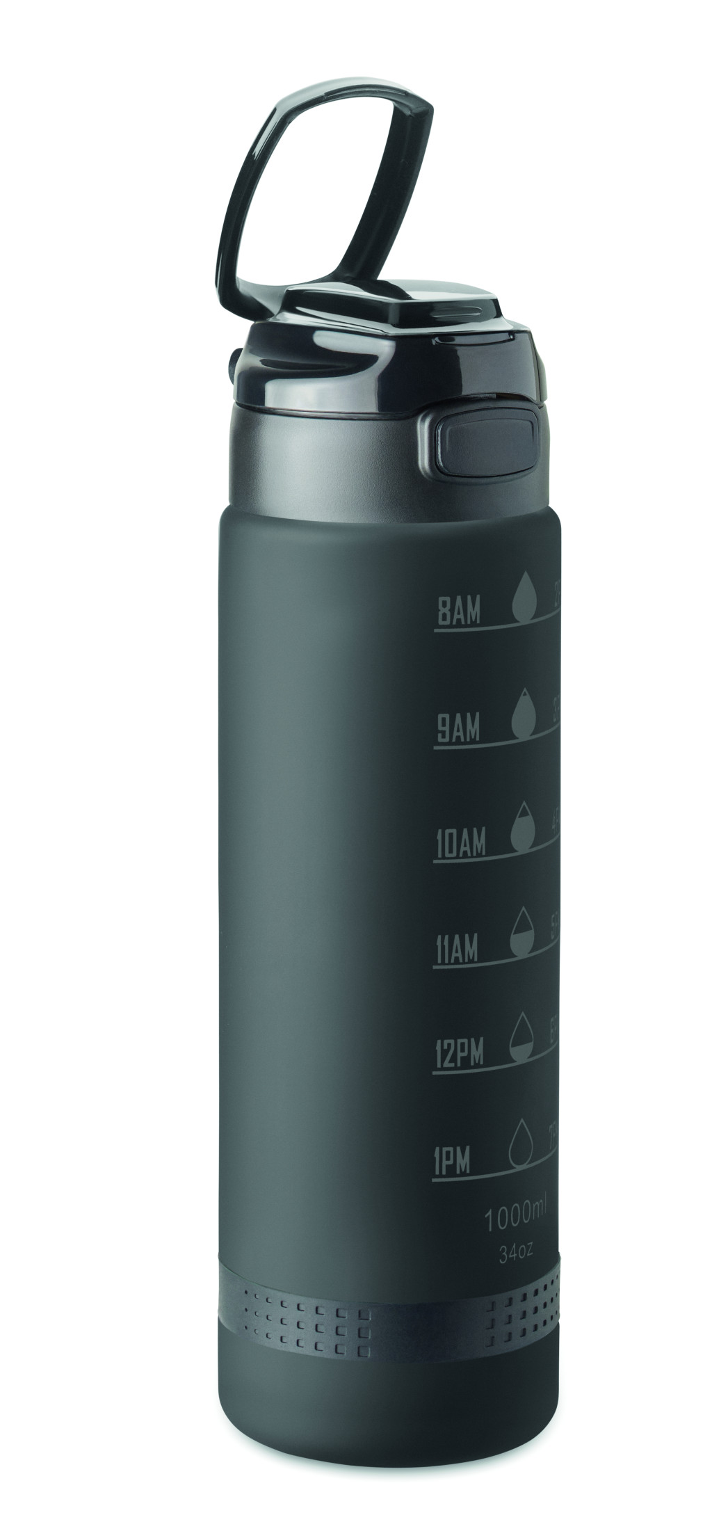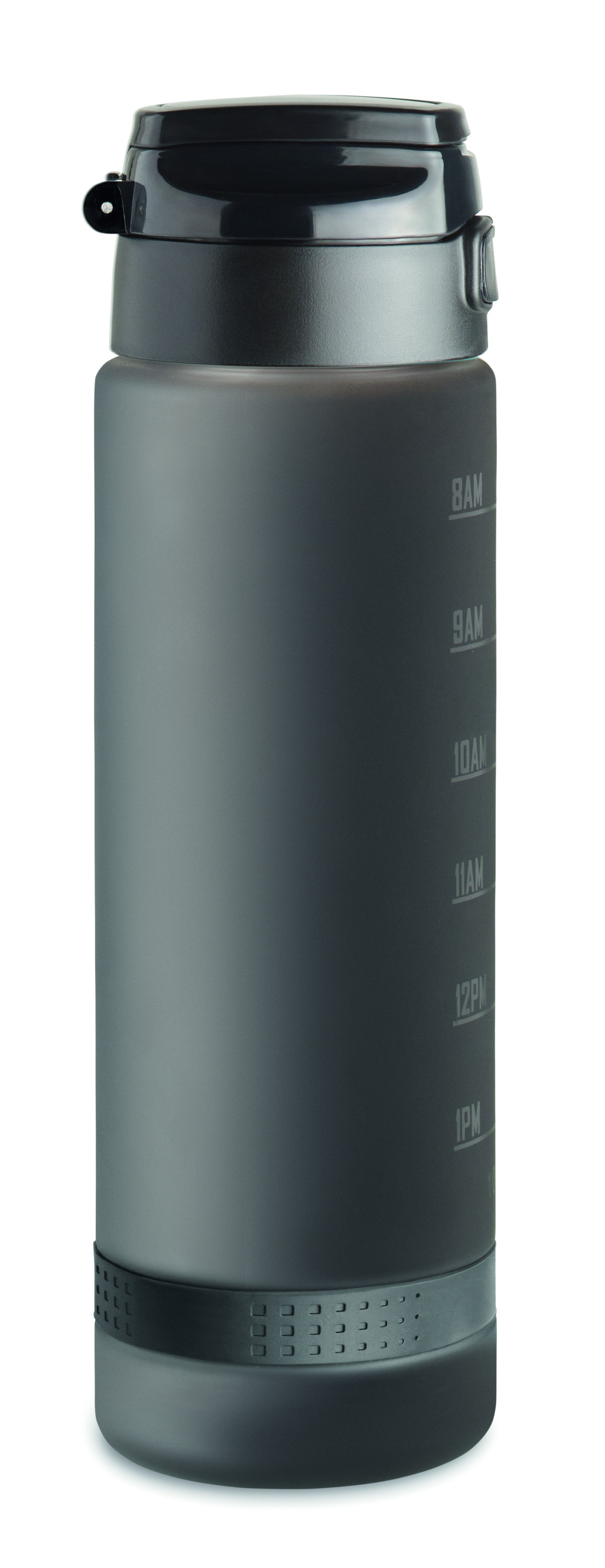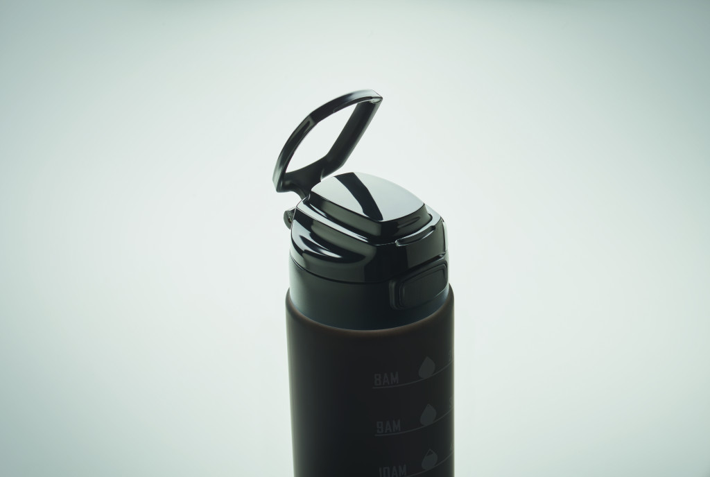 Sportkulacs RPET-ből, motivációs időjelzéssel, egy kézzel nyitható, felpattintható fedéllel, biztonsági zárral és hordfüllel. Szivárgásmentes. Űrtartalom: 1 liter.