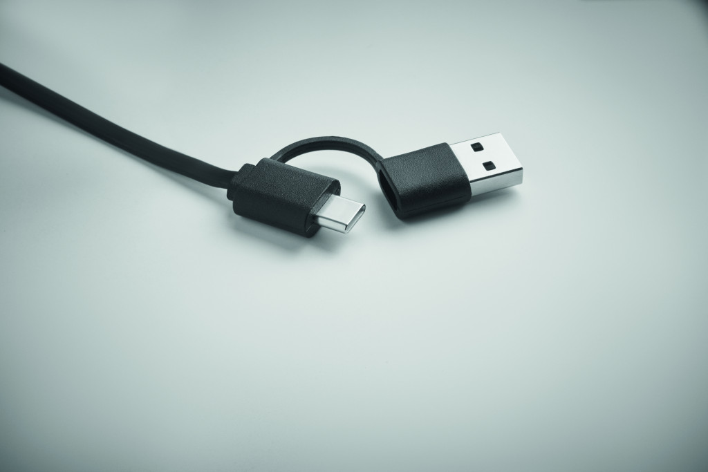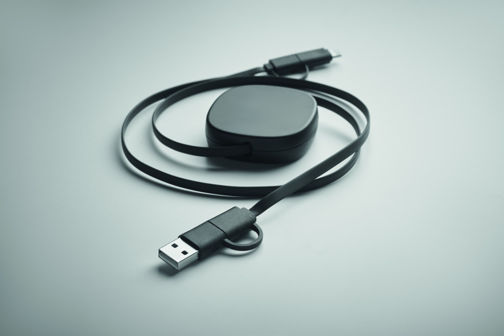 60W-os visszahúzható töltőkábel újrahasznosított ABS házban. Bemenet: 2 az 1-ben C-típusú és USB-A. Kimenet: C-típusú és mikro-B (2 az 1-ben). Kábel hossza: 80 cm.