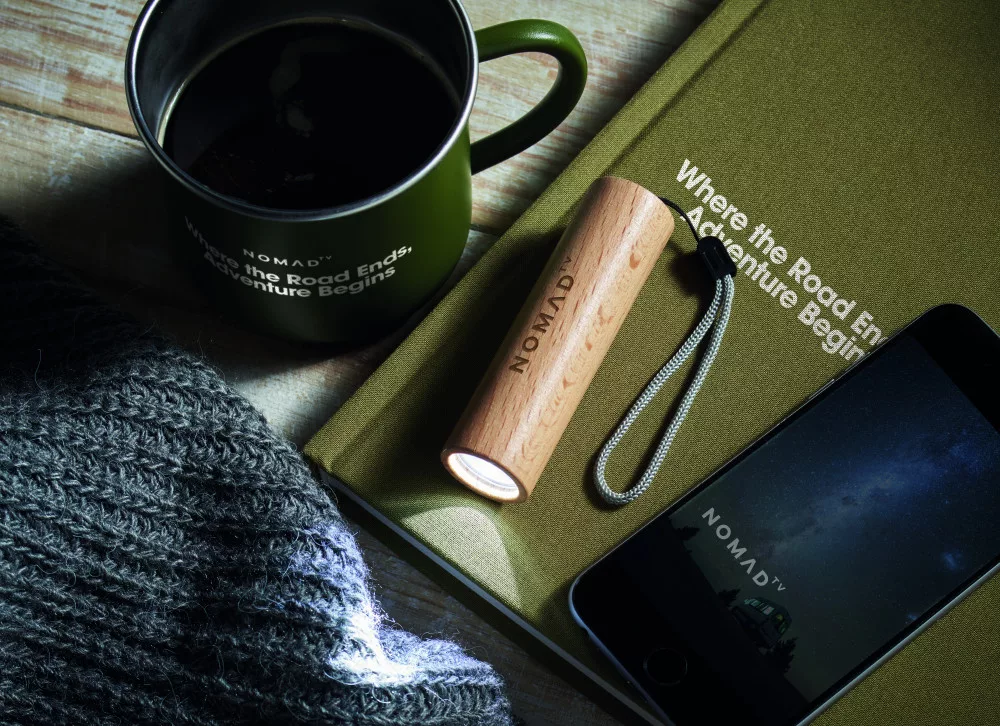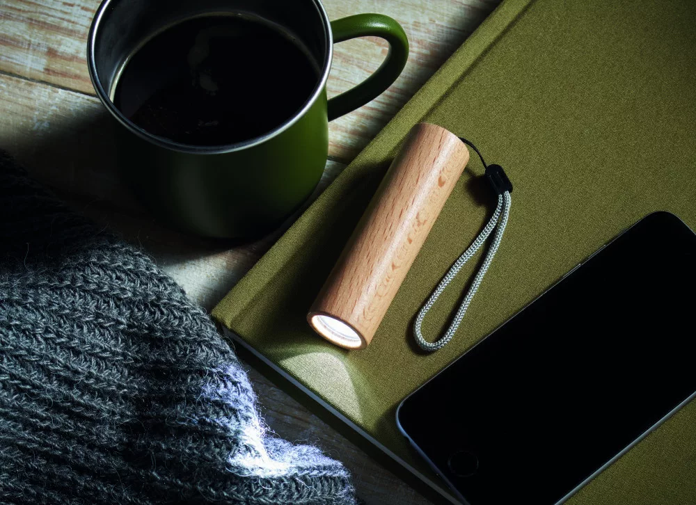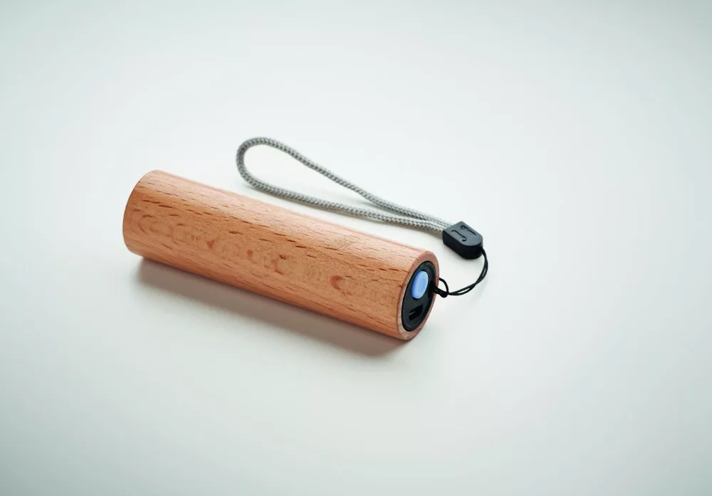Bükkfából készült újratölthető zseblámpa 5 W, 70 lumen (1 LED) fényerővel. 3 állítható fényerőséggel, csuklópánttal. 300 mAh újratölthető elemmel.