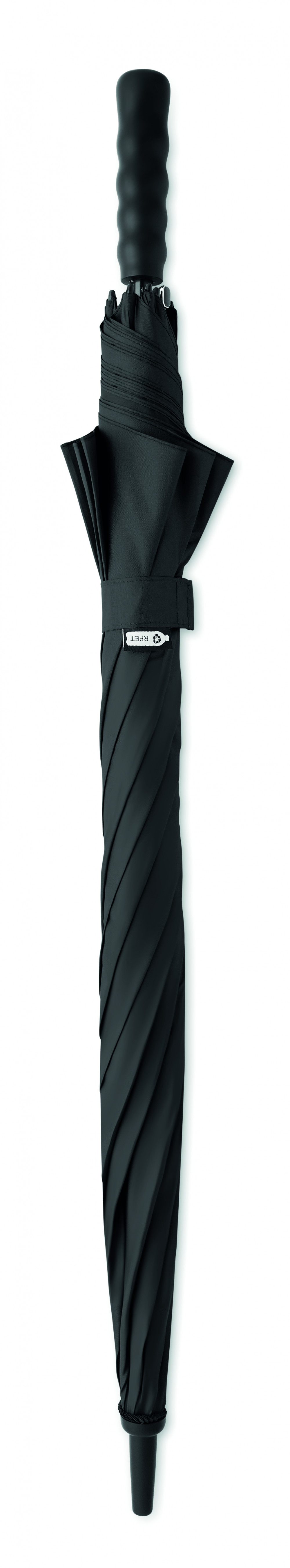 27 colos, automatikus nyitású, szélálló esernyő 190T RPET pongee nyersselyem anyagból. Üvegszálas rúd és bordák. Búzaszalma és Újrahasznosított ABS markolat. Műanyag cikkelyzáró elemek és csúcs.
