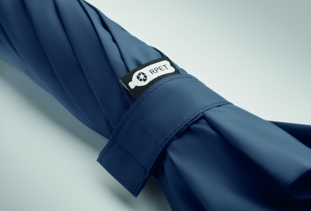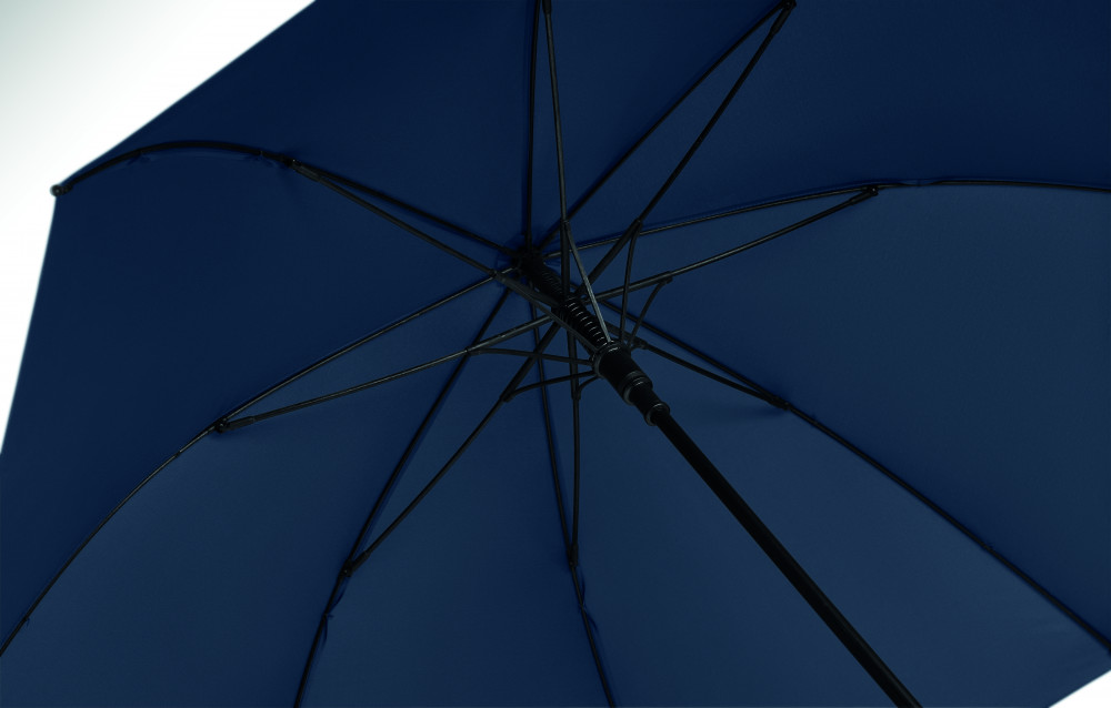27 colos, automatikus nyitású, szélálló esernyő 190T RPET pongee nyersselyem anyagból. Üvegszálas rúd és bordák. Búzaszalma és Újrahasznosított ABS markolat. Műanyag cikkelyzáró elemek és csúcs.