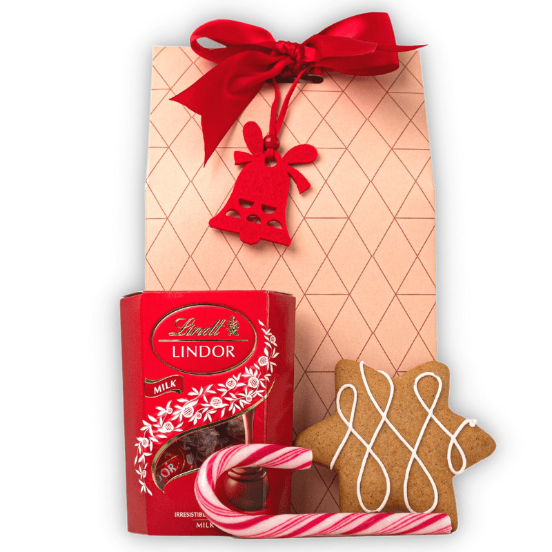 Egy gyönyörű karácsonyi filc dísz, amit ajándékozottad azonnal felakaszthat a fára. Egy kézműves mézeskalács, amely nemcsak finom, hanem szeretettel is át van itatva. Egy csillogó karácsonyi cukorpálca, mely a gyerekkor emlékeit hozza el, és nem utolsósorban egy Lindt tejcsokoládé praliné, hogy az édes kényeztetés se maradjon el.