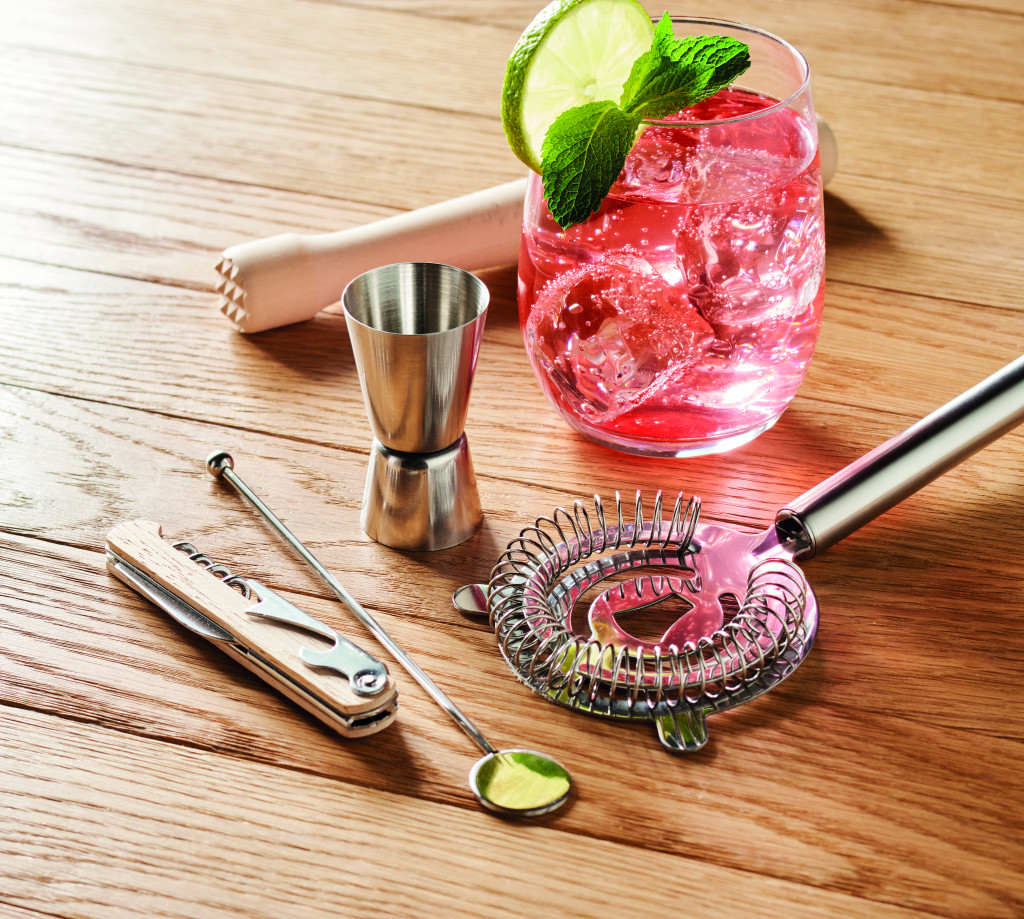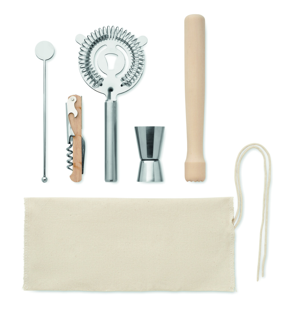Koktélkészlet madzaggal átkötött, 220 gr/m² vastag pamut tasakban. Tartalmaz kétoldalas mérőedényt (15 és 30 ml), törőfát, szűrőt, koktélkeverő pálcát és pincérkést.