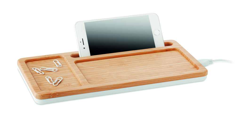 Vezeték nélküli töltő tároló részekkel, bambusz borítással, USB elosztóval, okostelefon tartóval. USB teljesítmény DC5V/1A, vezeték nélküli teljesítmény DC5V/1A (5W). C típusú csatlakozóval. Qi készülékekhez (újabb Android, iPhone® 8, X, stb.). A bambusz természetes anyag, színében, mintázatában és méretében esetenként eltérő lehet.