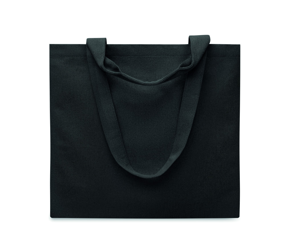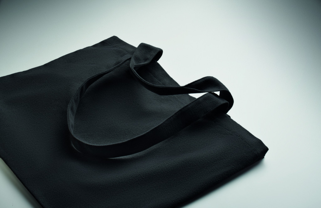 Újrahasznosított anyagból (60% újrahasznosított pamut, 40% újrahasznosított poliészter) készült bevásárló- vagy strandtáska rövid és hosszú fülekkel. 320 g/m².