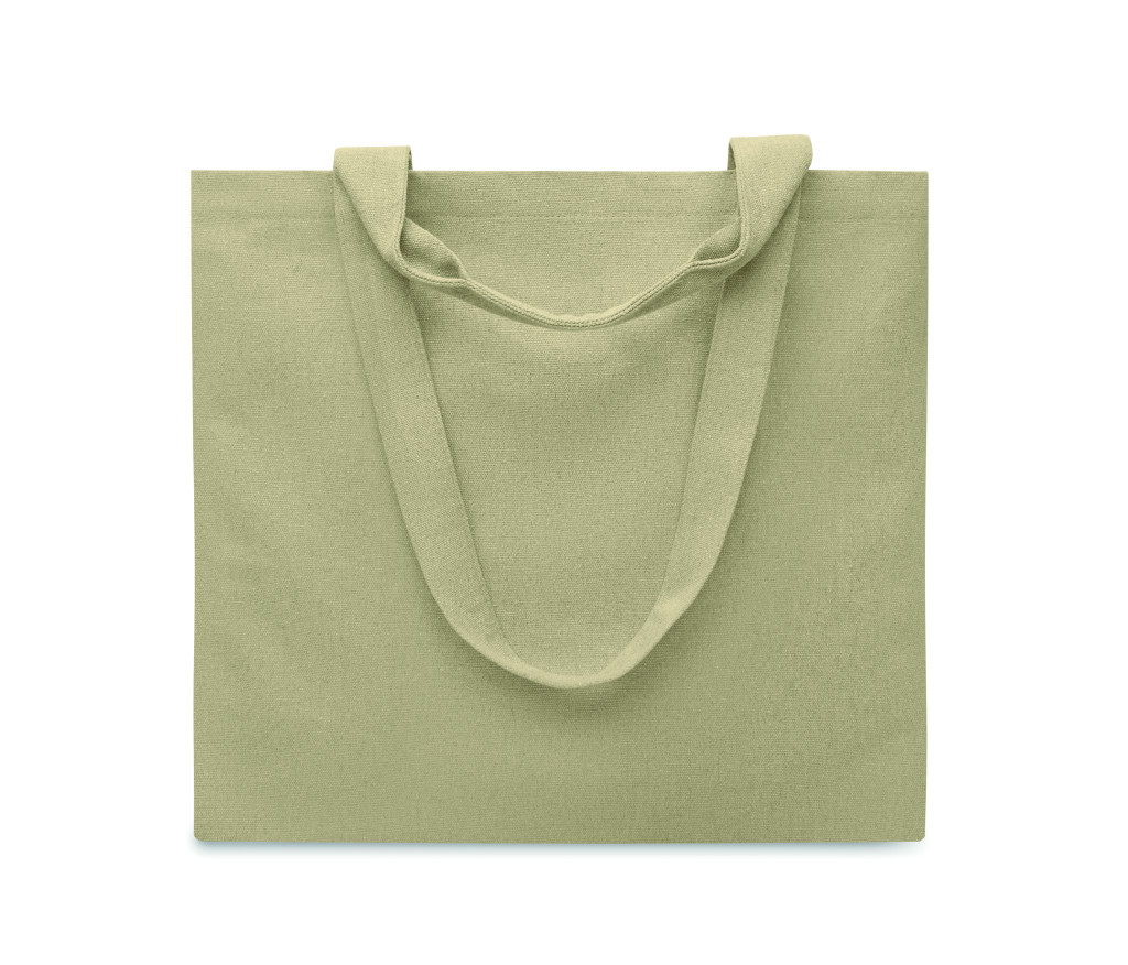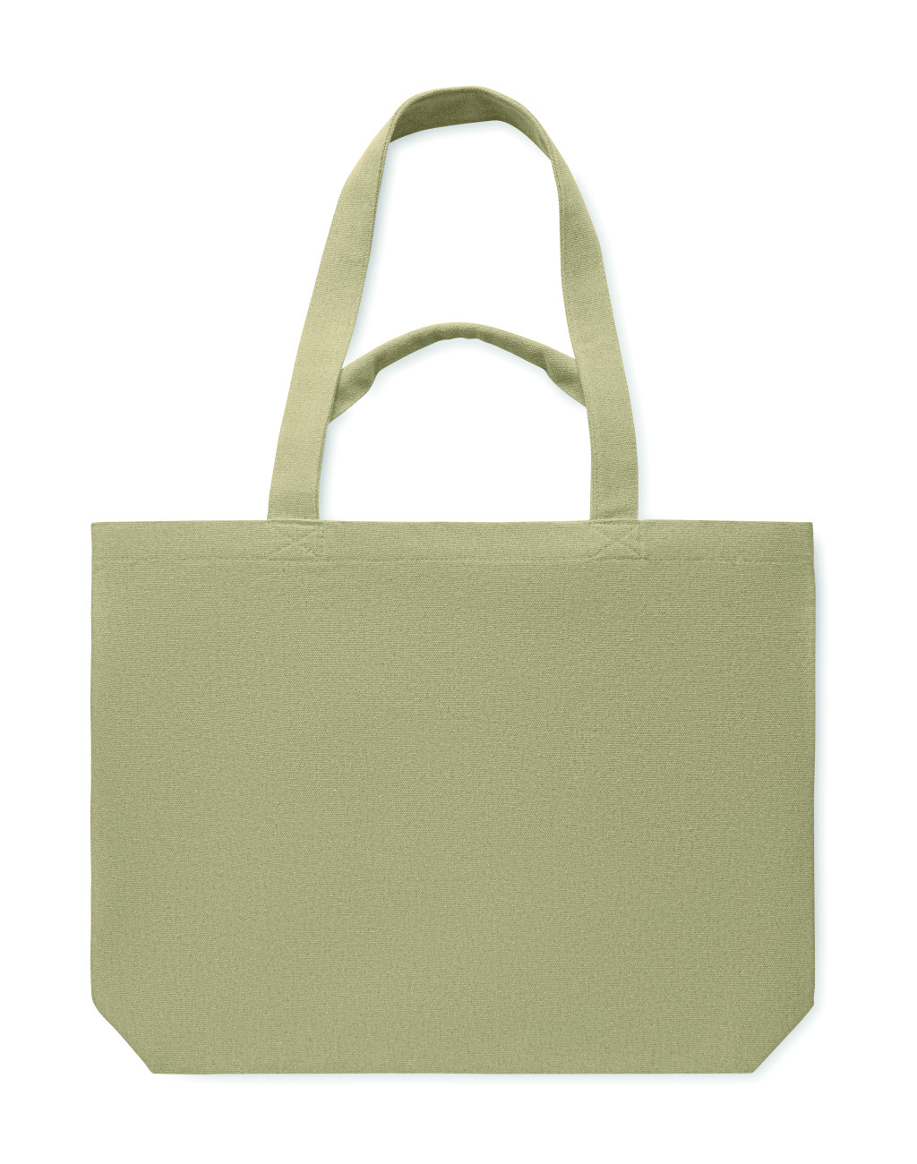 Újrahasznosított anyagból (60% újrahasznosított pamut, 40% újrahasznosított poliészter) készült bevásárló- vagy strandtáska rövid és hosszú fülekkel. 320 g/m².