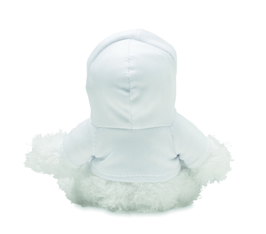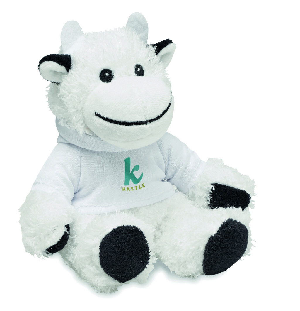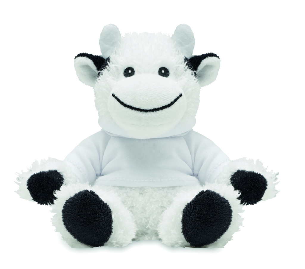 Kapucnis pulóvert viselő plüss tehén. A pulóver ideális szublimációs nyomtatáshoz.
