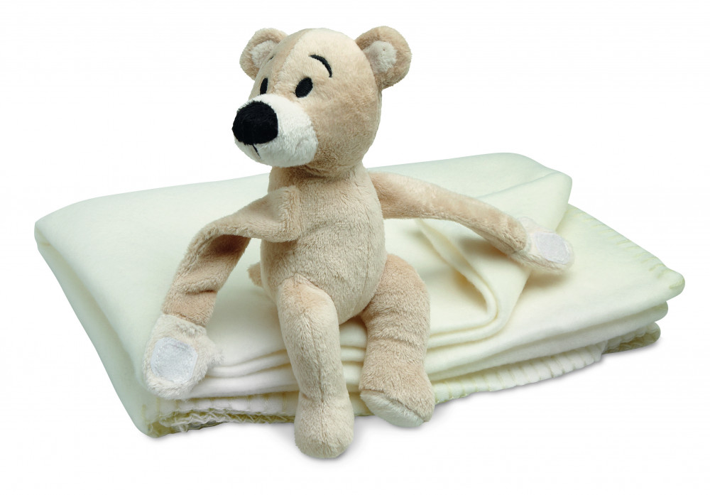 Polár takaró, melyet egy plüss maci tart a tépőzáras kezei között.