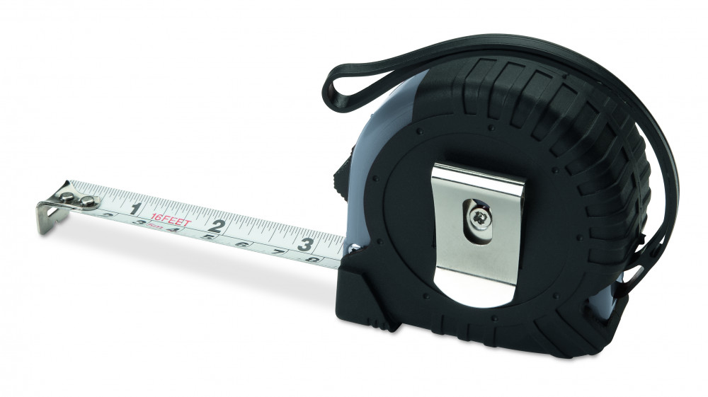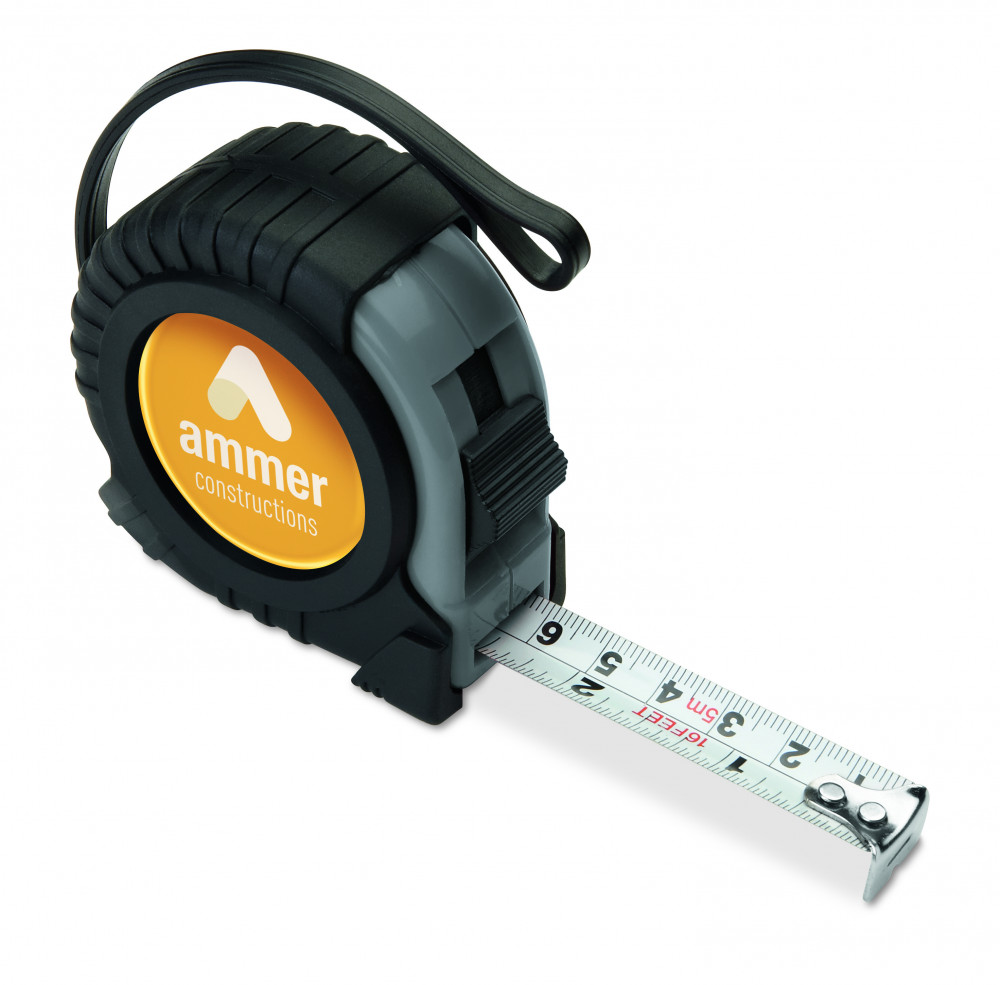 5 méteres mérőszalag piros házzal. ABS anyagból. Csuklópánttal és fényes, ezüstös, övre akasztható csíptetővel.