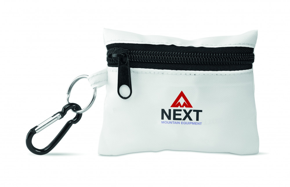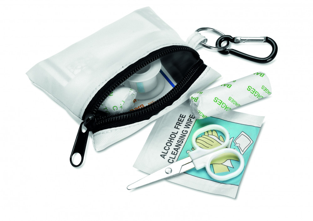 Elsősegély készlet. Tartalma: olló, nedves törlőkendő, géz, 3 fültisztító, 5 sebtapasz. Poliészter tokban, karabinerrel.